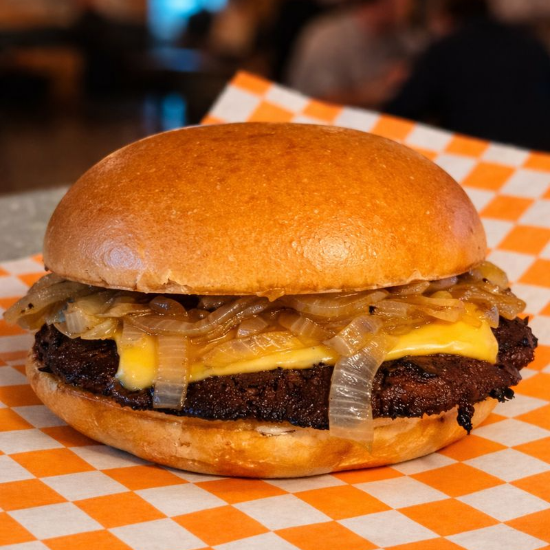 Smash 100 g, cebolla caramelizada, queso americano, pan brioche.