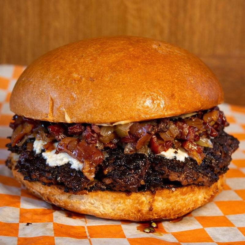 Smash 100 g, queso de cabra, mermelada de tocino, pan brioche.