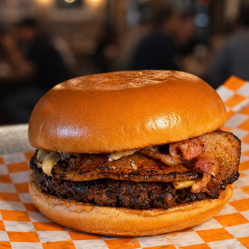 Smash 100 g, tocino crujiente, queso americano, pan brioche.