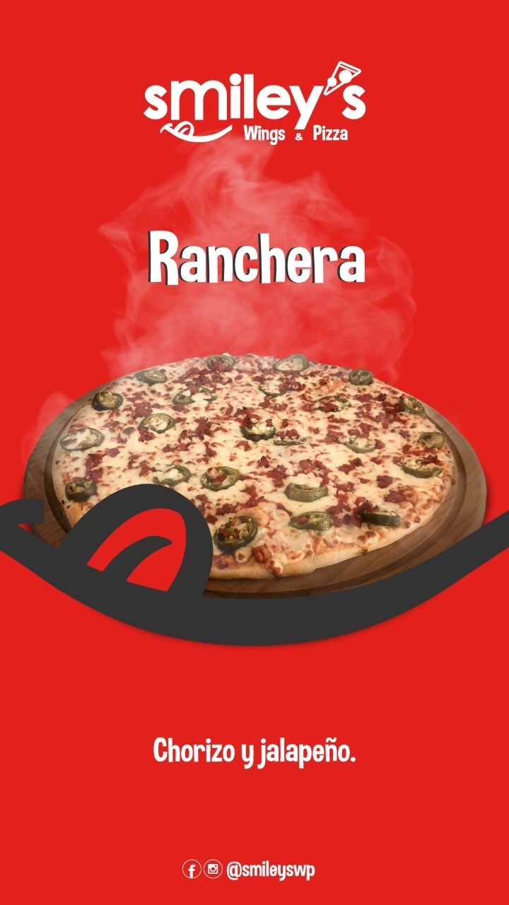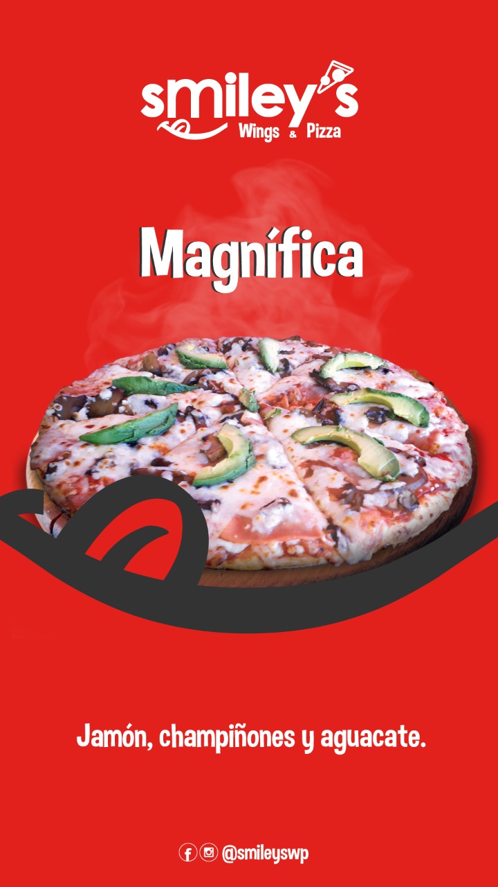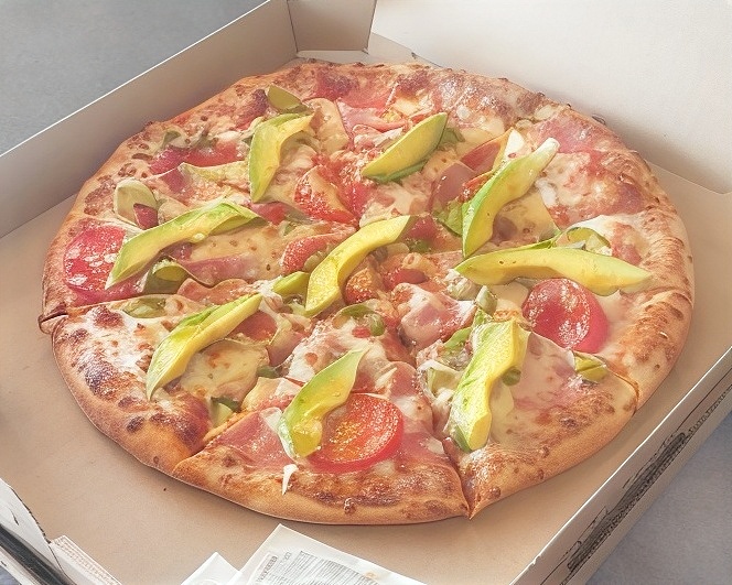 Jamón, chorizo, jalapeño, jitomate aguacate y cebolla acompañada de tu salsa base favorita. Pizza de 36 cms de diámetro con 8 rebanadas