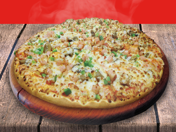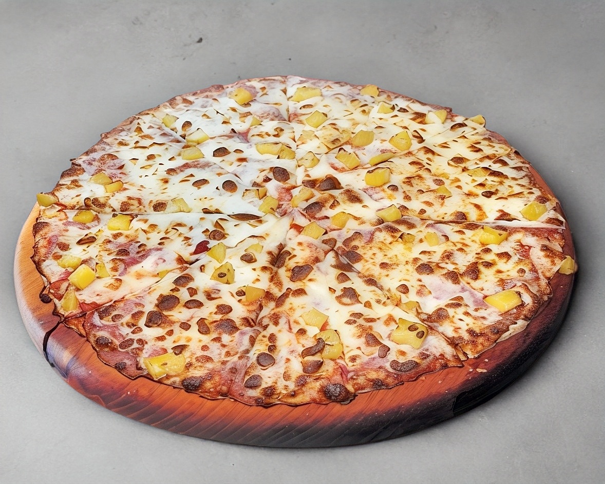 Jamón, piña y extra queso acompañada de tu salsa base favorita. Pizza de 36 cms de diámetro con 8 rebanadas