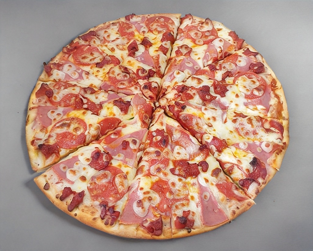 Jamón, peperoni y chorizo, acompañada de la salsa a tu elección. Pizza de 36 cms de diámetro con 8 rebanadas