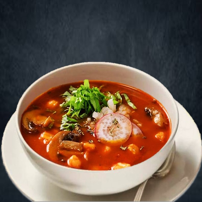Pozole con carnitas, acompañado de lechuga, rabano, oregano y chile de árbol.