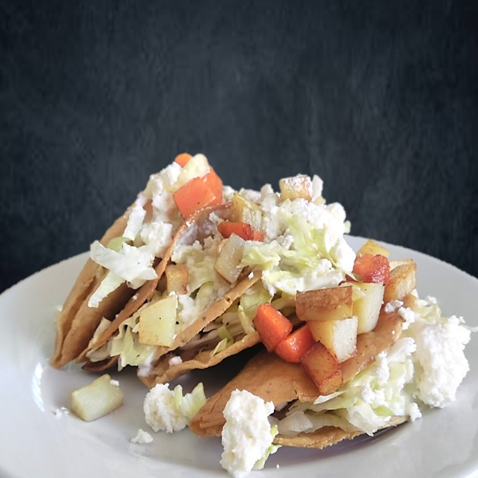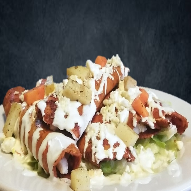 (4 pzas) Rellenos de carnitas, con lechuga, crema, queso, papa y zanahoria.