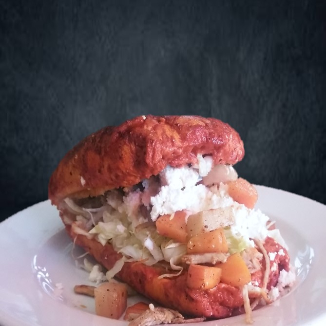 Telera en salsa de chile guajillo, relleno de carnitas o de jamón, frijoles, queso, crema, papa y zanahoria.