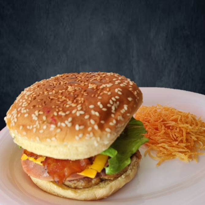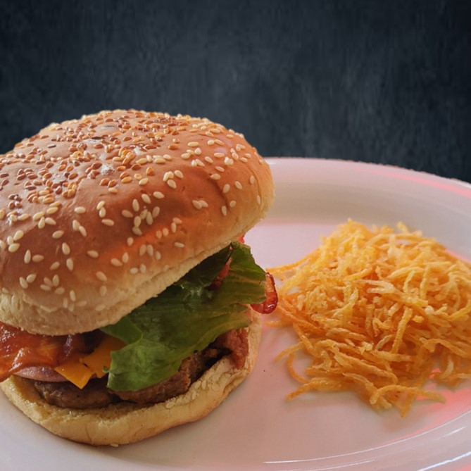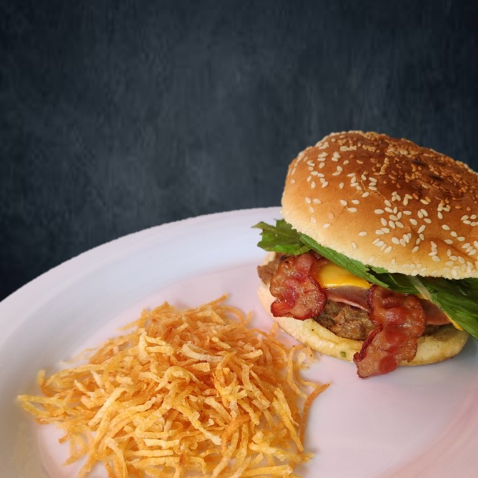 Hamburguesa con Tocino y Papas Fritas (Paja)