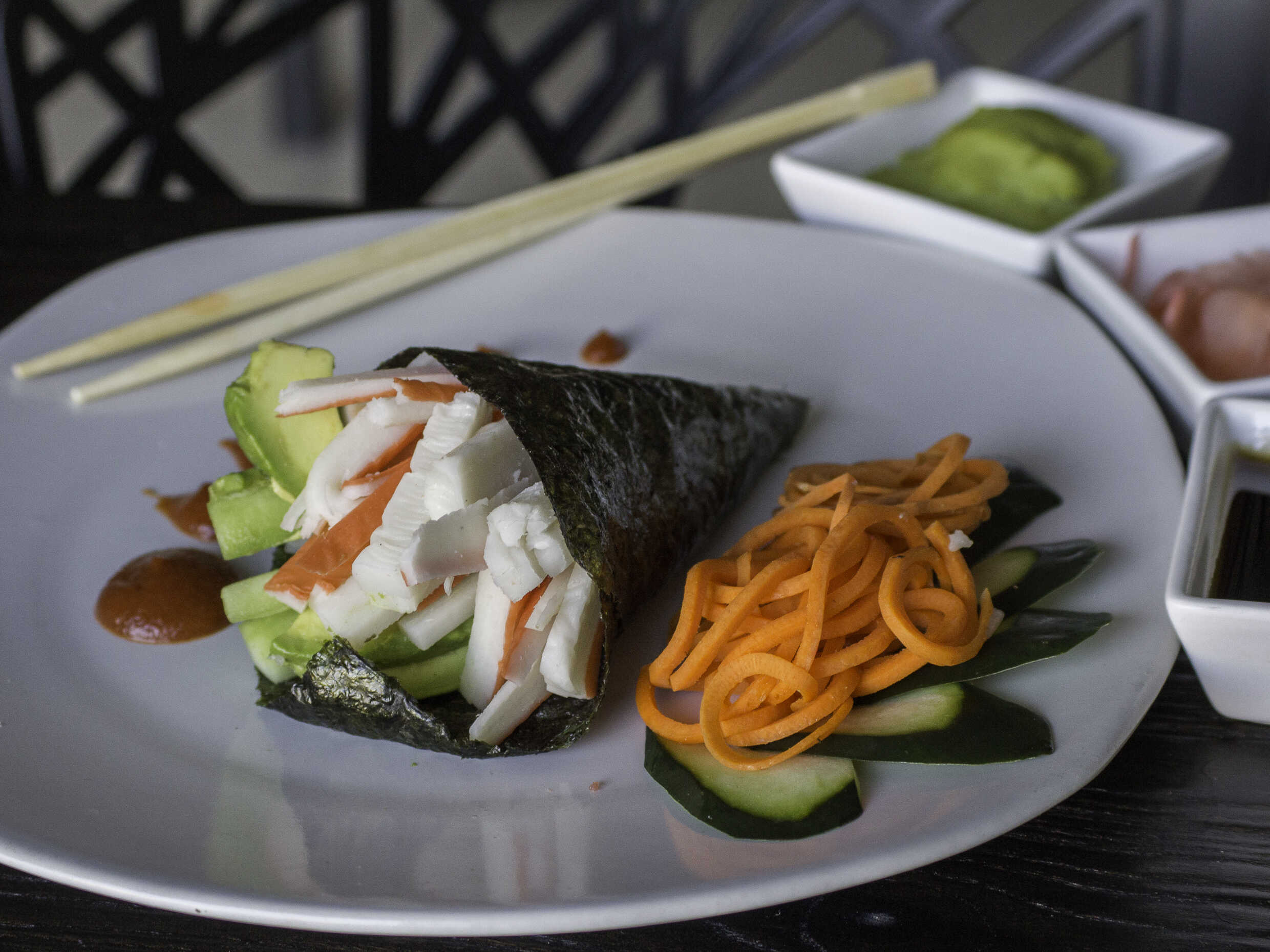 Base espiral de pepino, betabel, zanahoria, aguacate, mango, fresa edamames arándano, nori, salsa chipotle.