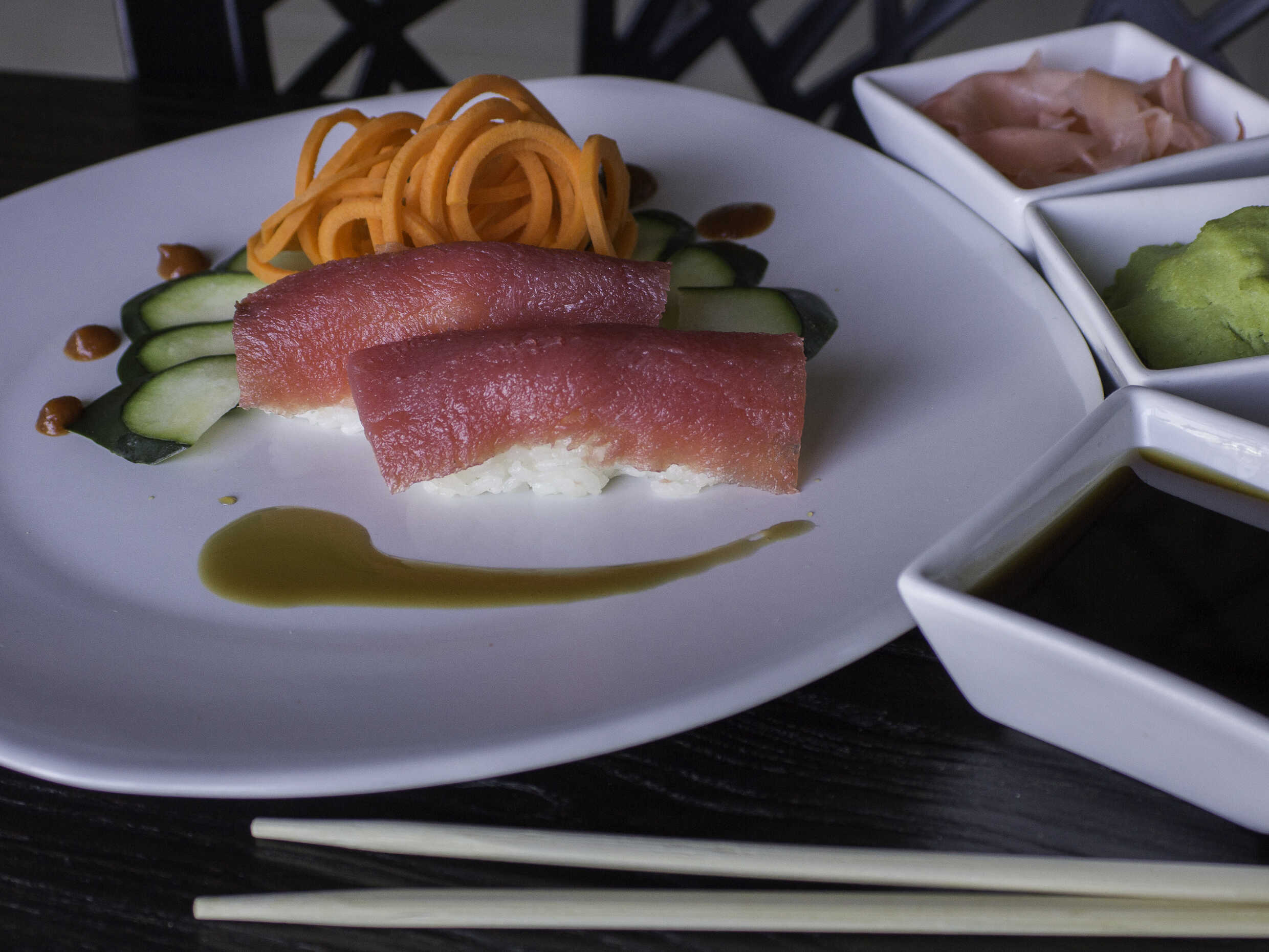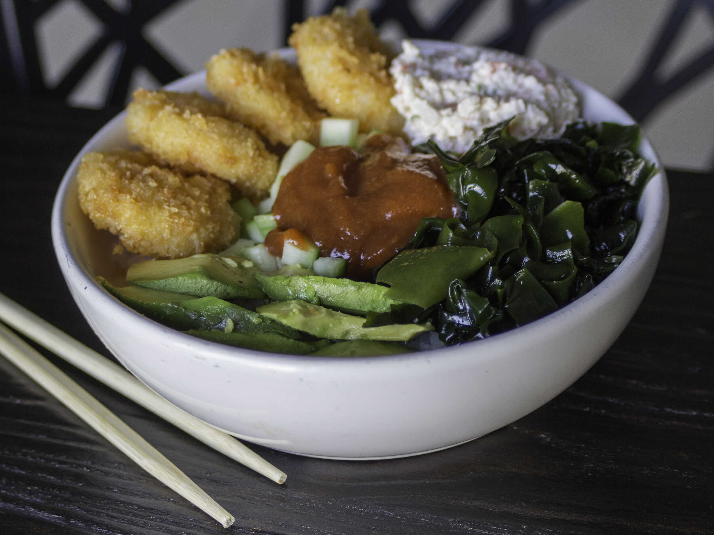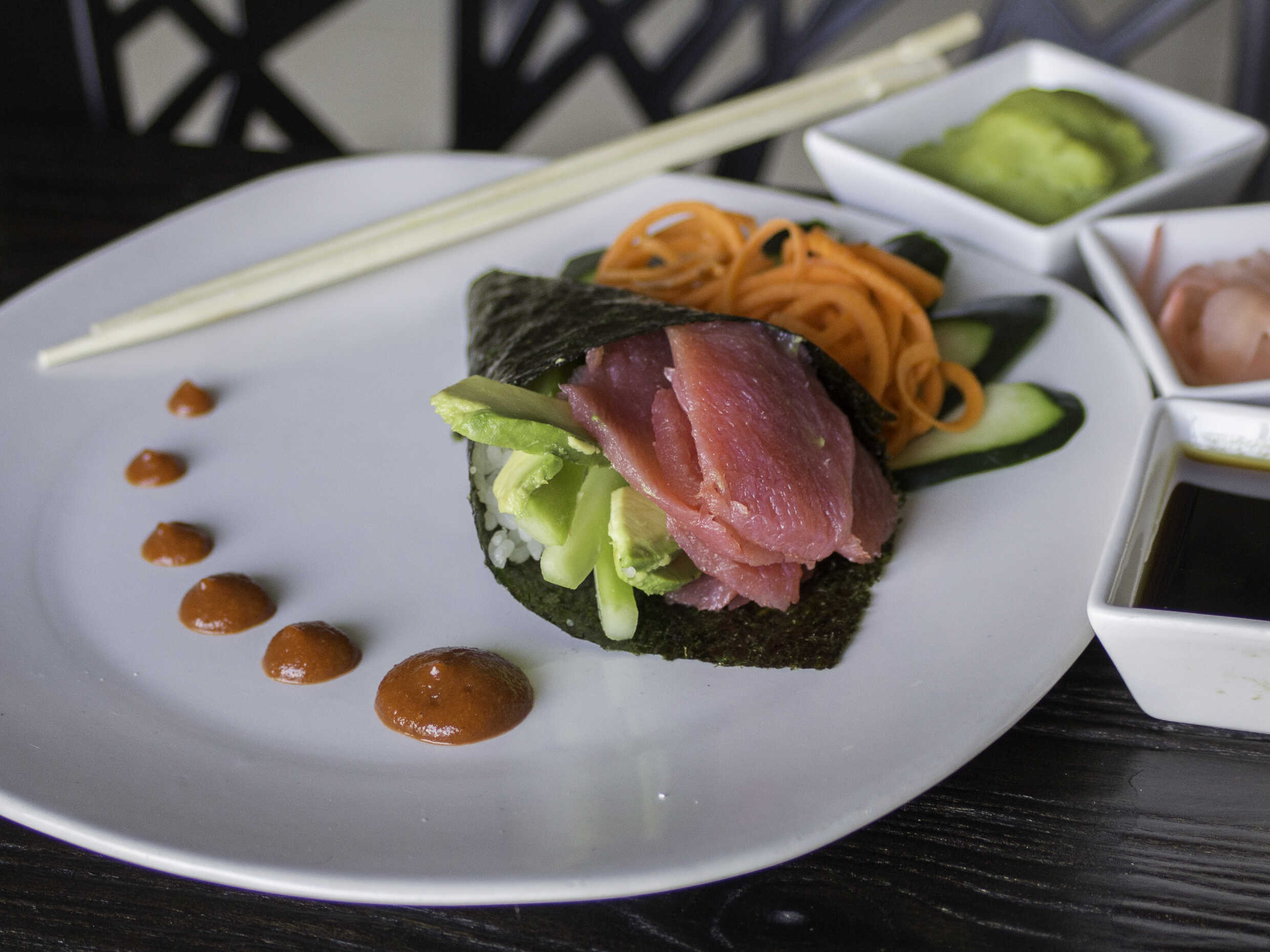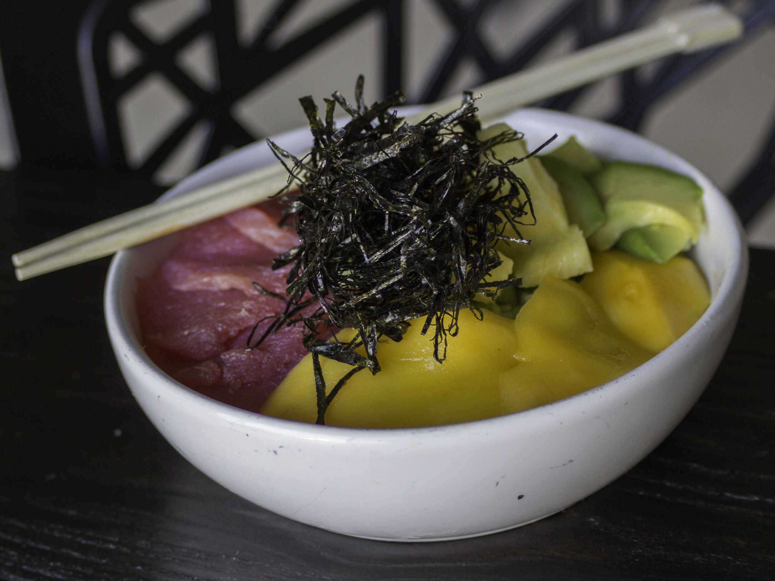 Base de arroz gohan, atún spicy pepino, aguacate, piña, mango, nori, salsa chipotle.