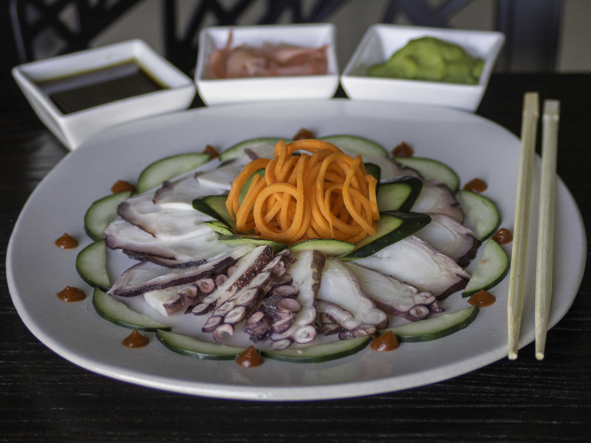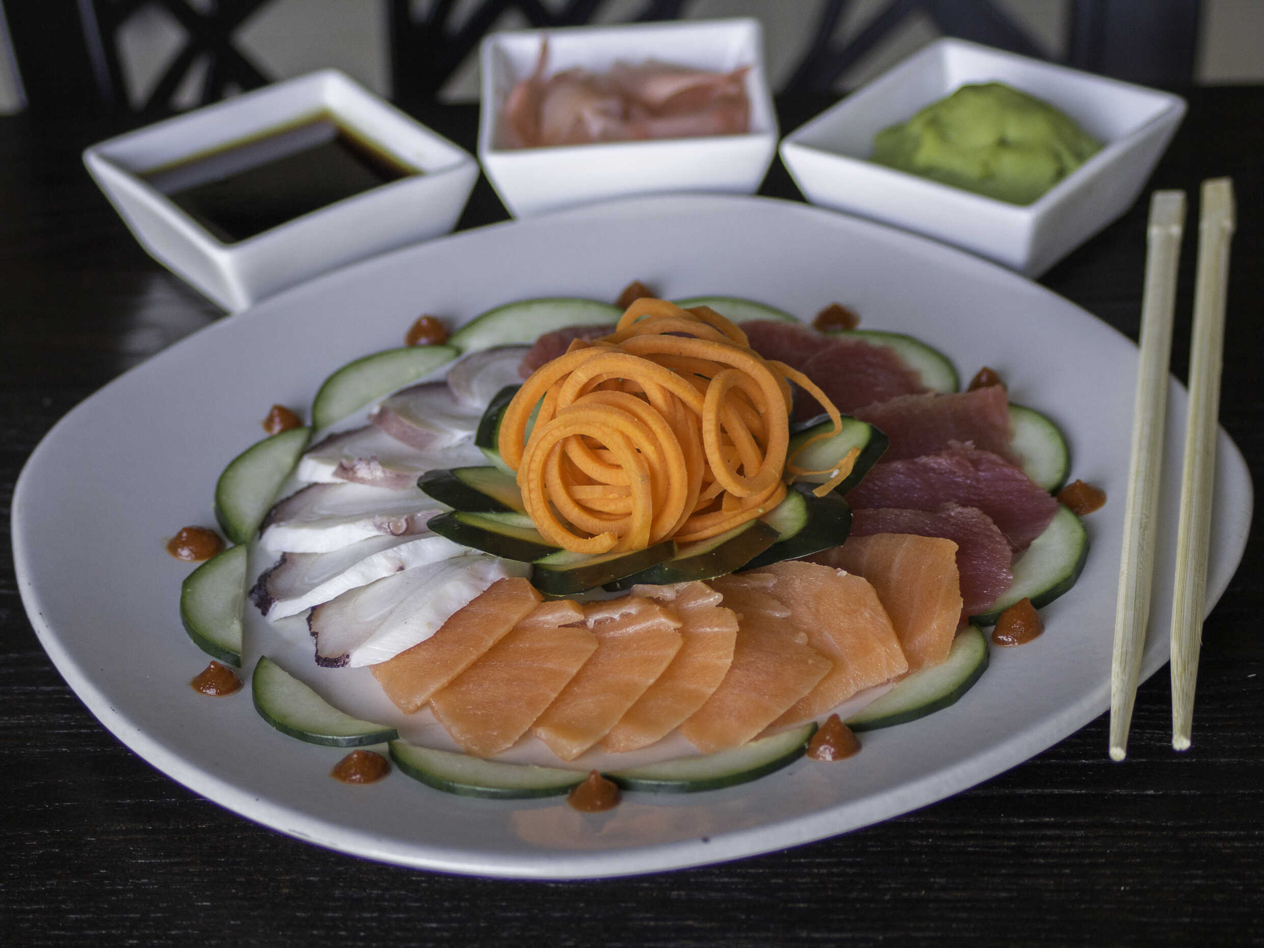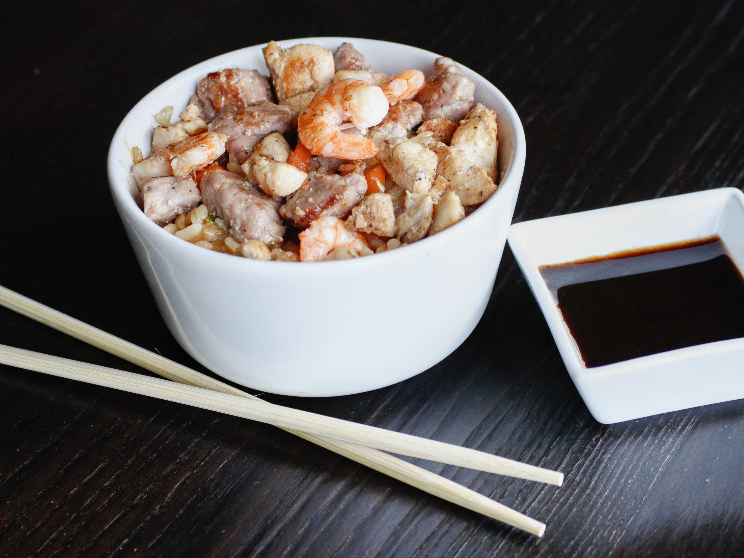 Arroz frito con camarón, salmón a la plancha, arrachera, pollo, pulpo, huevo, zanahoria, calabaza y cebolla.