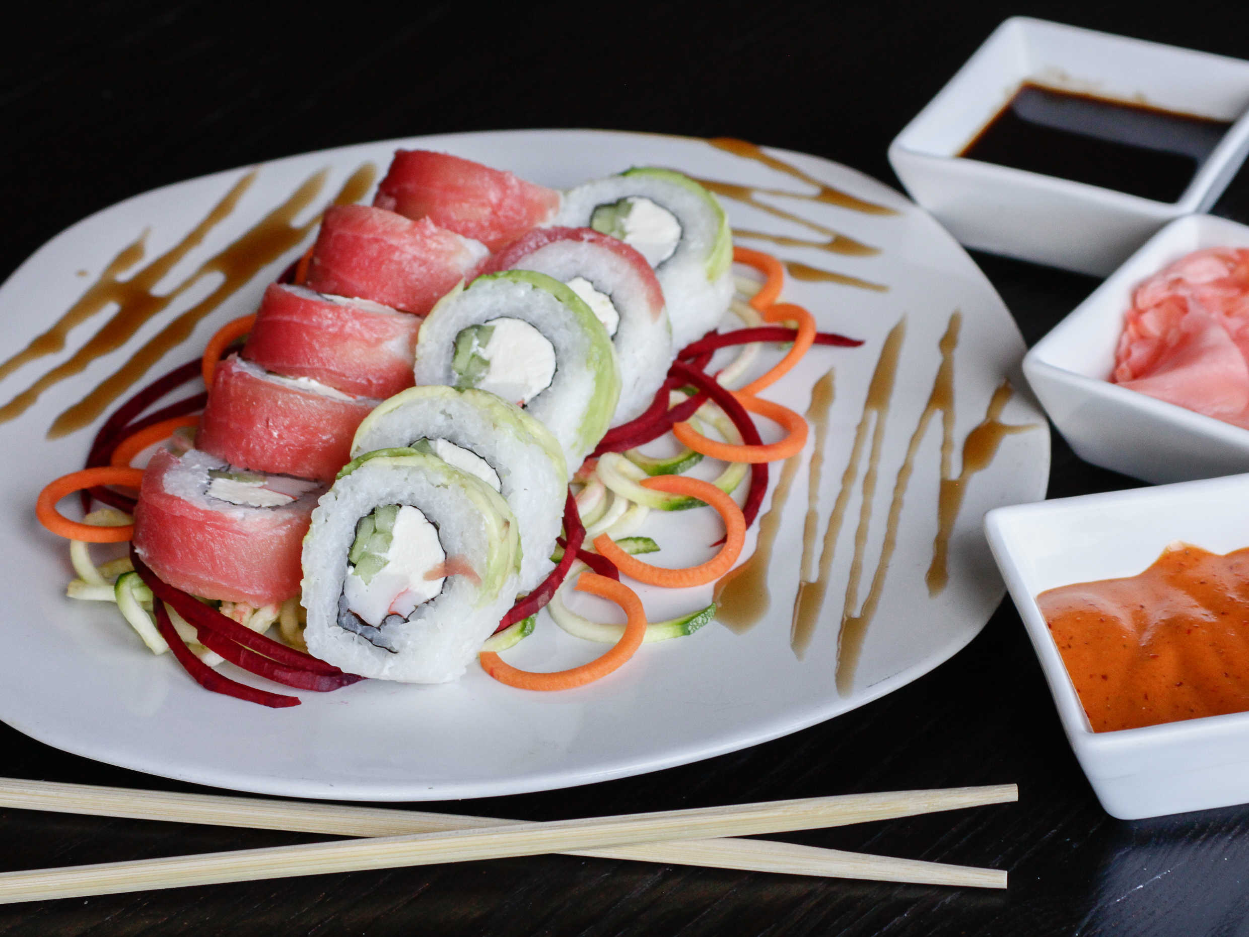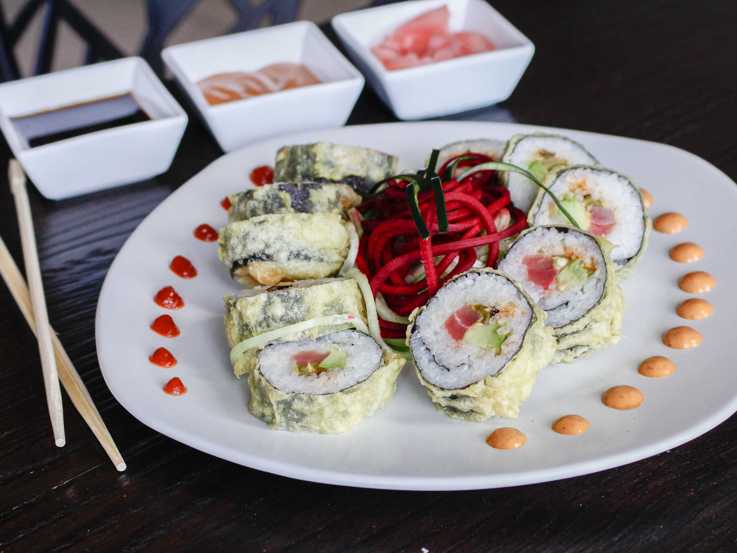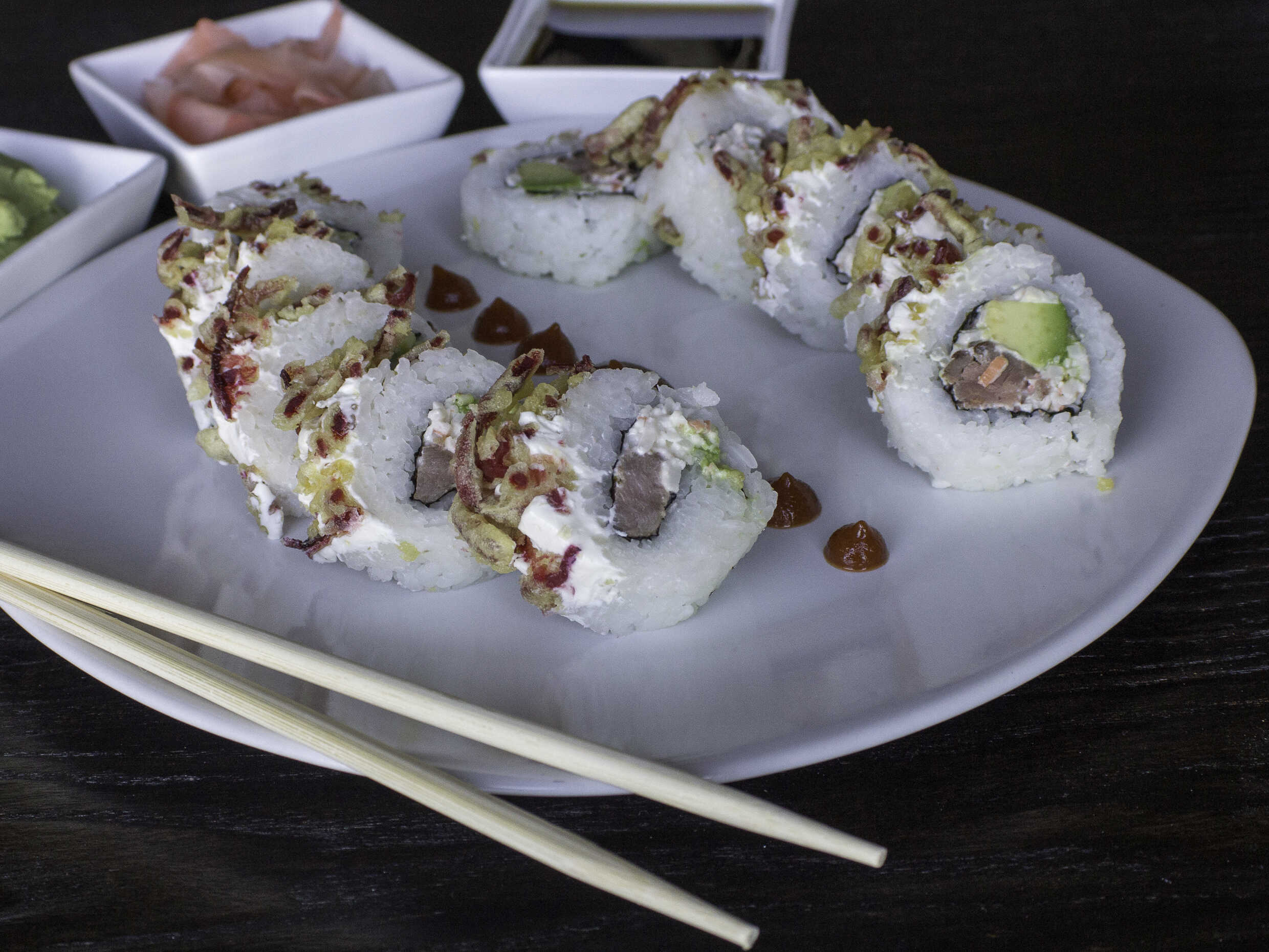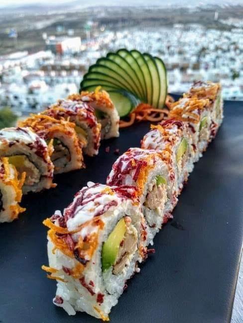 Atún spicy, chispas tempura, queso Philadelphia, aguacate, pepino, salsa chipotle.