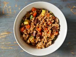 Arroz frito con arrachera, zanahoria, calabaza y cebolla.