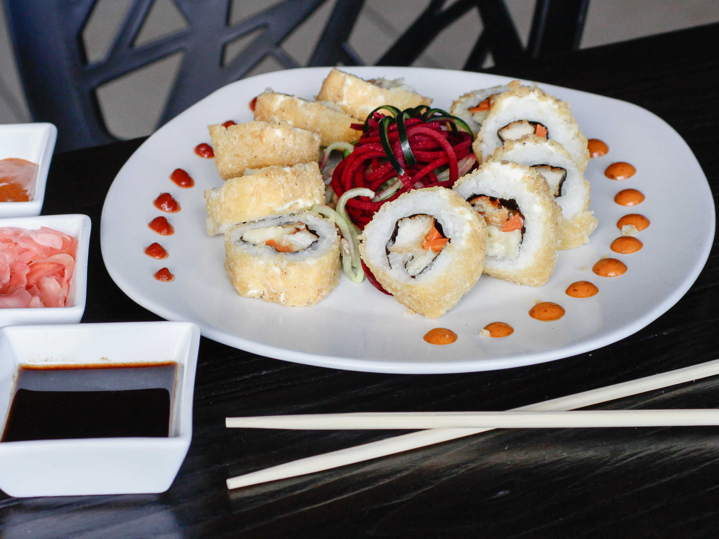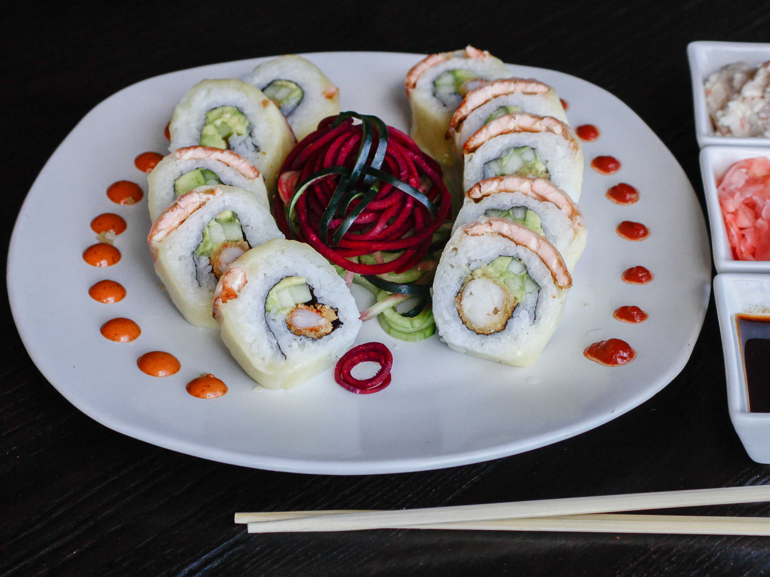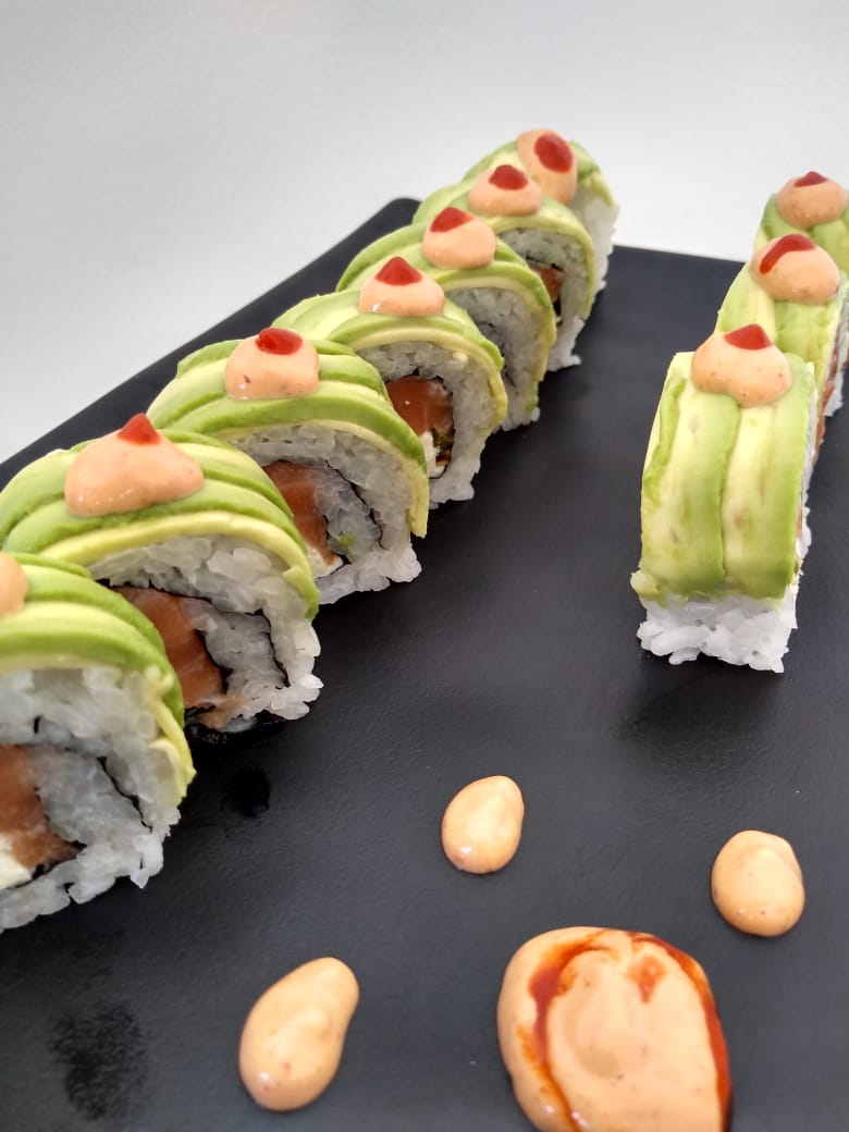 Aguacate chiles toreados, salmón spicy, queso Philadelphia salsa srirasha.