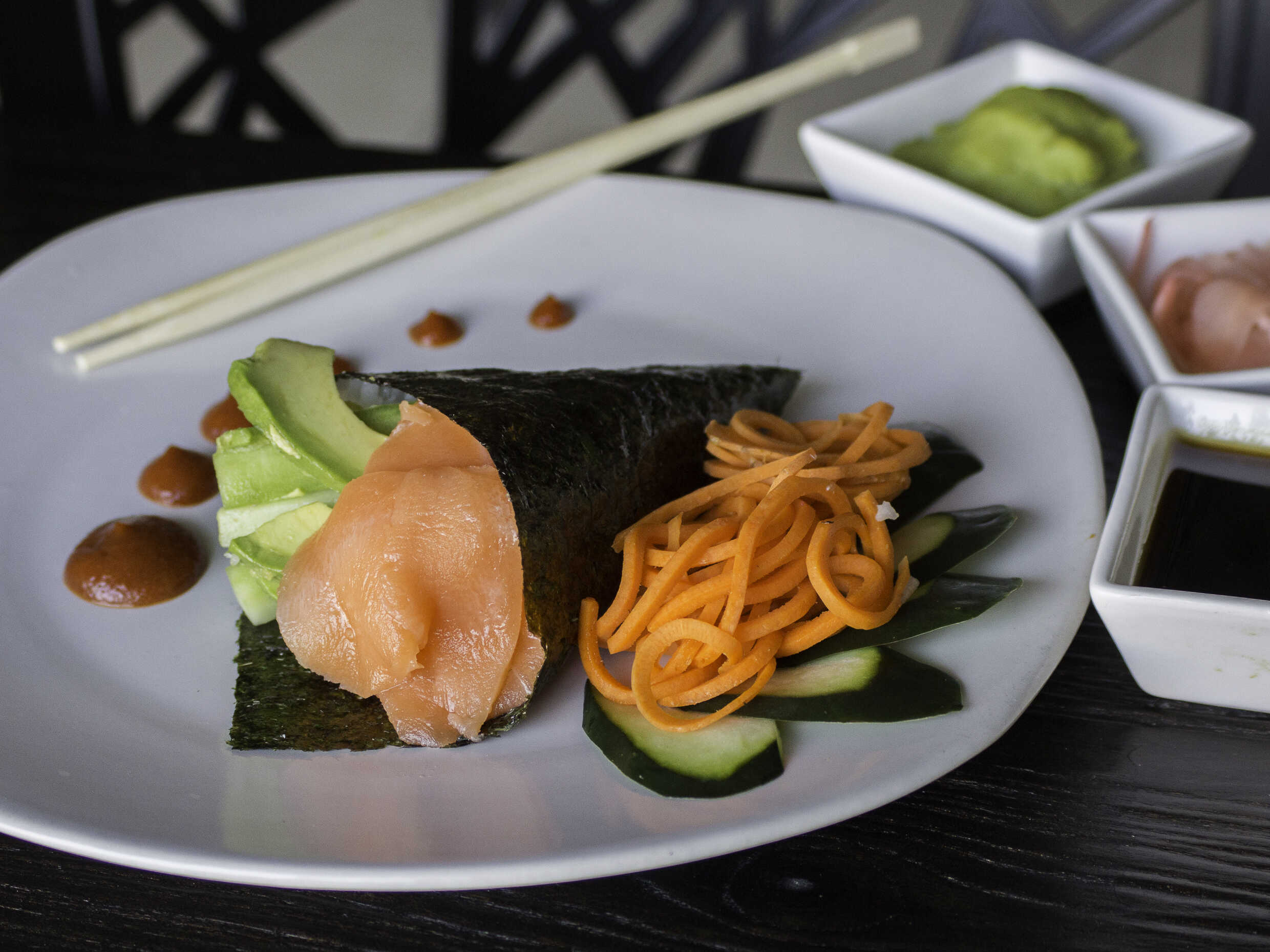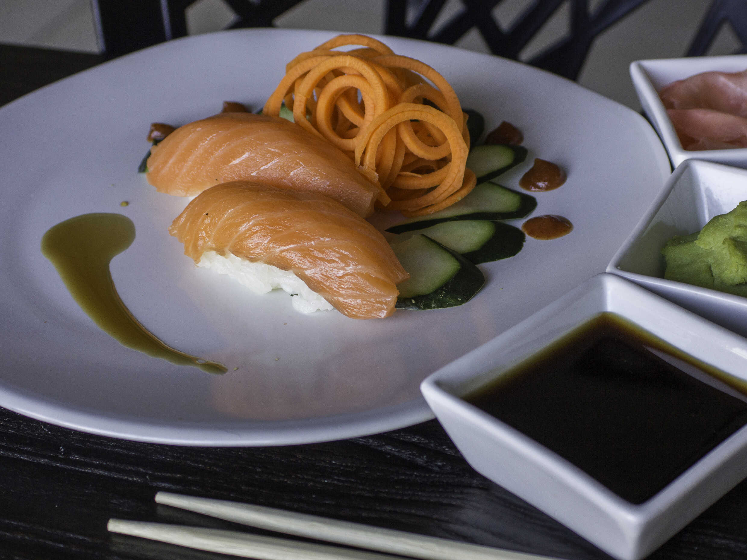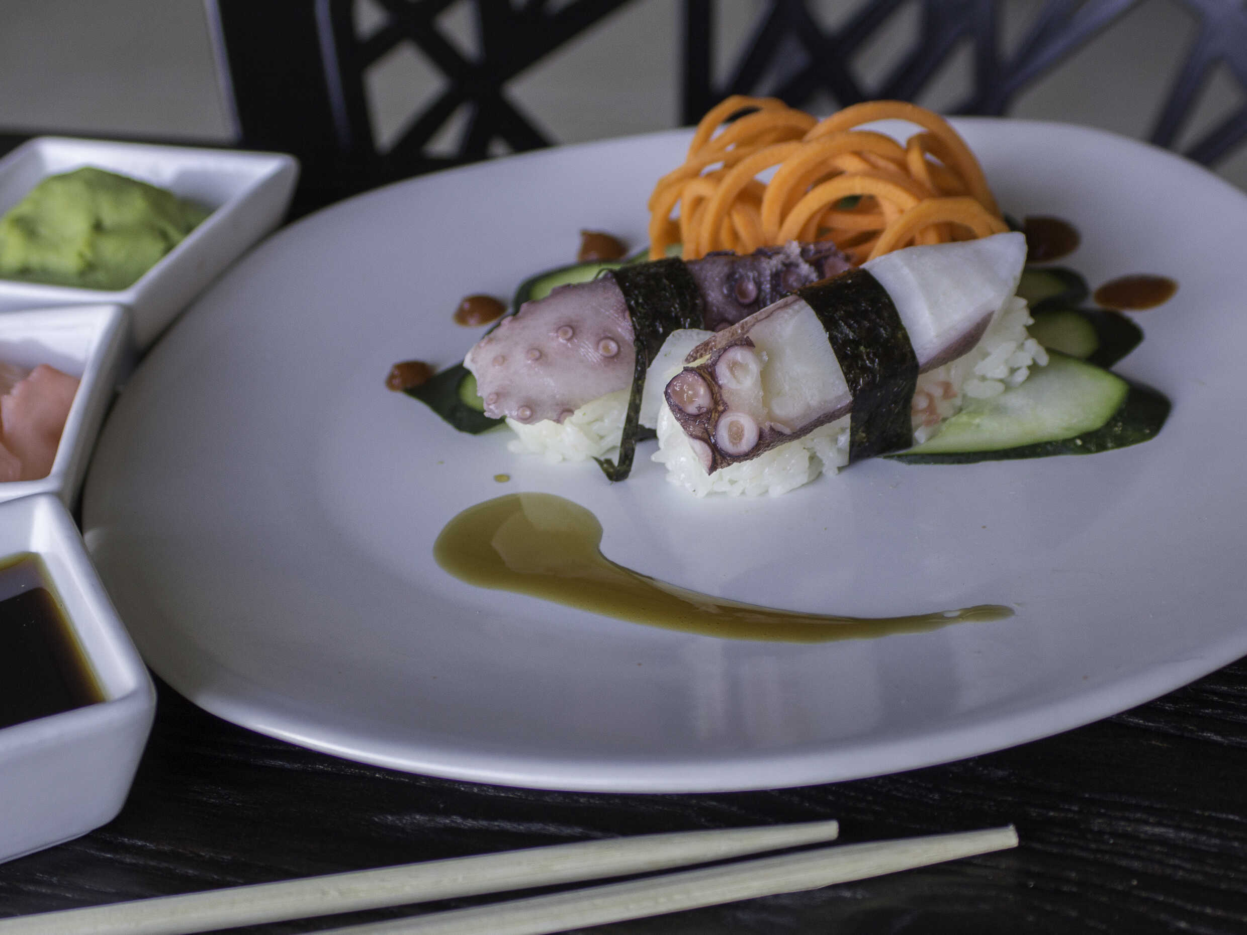 Aguacate chiles toreados, salmón spicy, queso Philadelphia salsa srirasha.