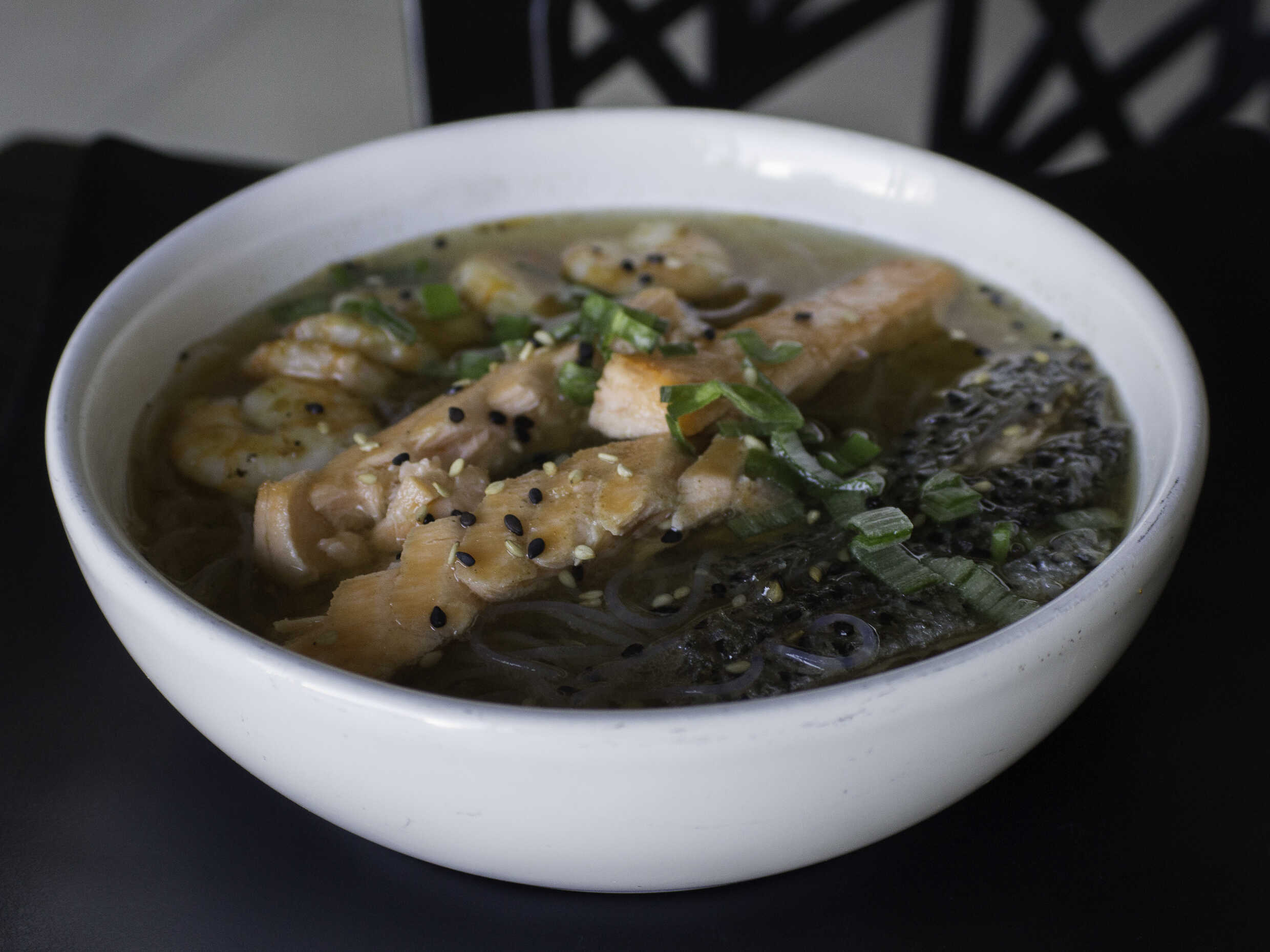 Harusame, salmón, piel de salmón, camarón, ajonjolí, cebollín.