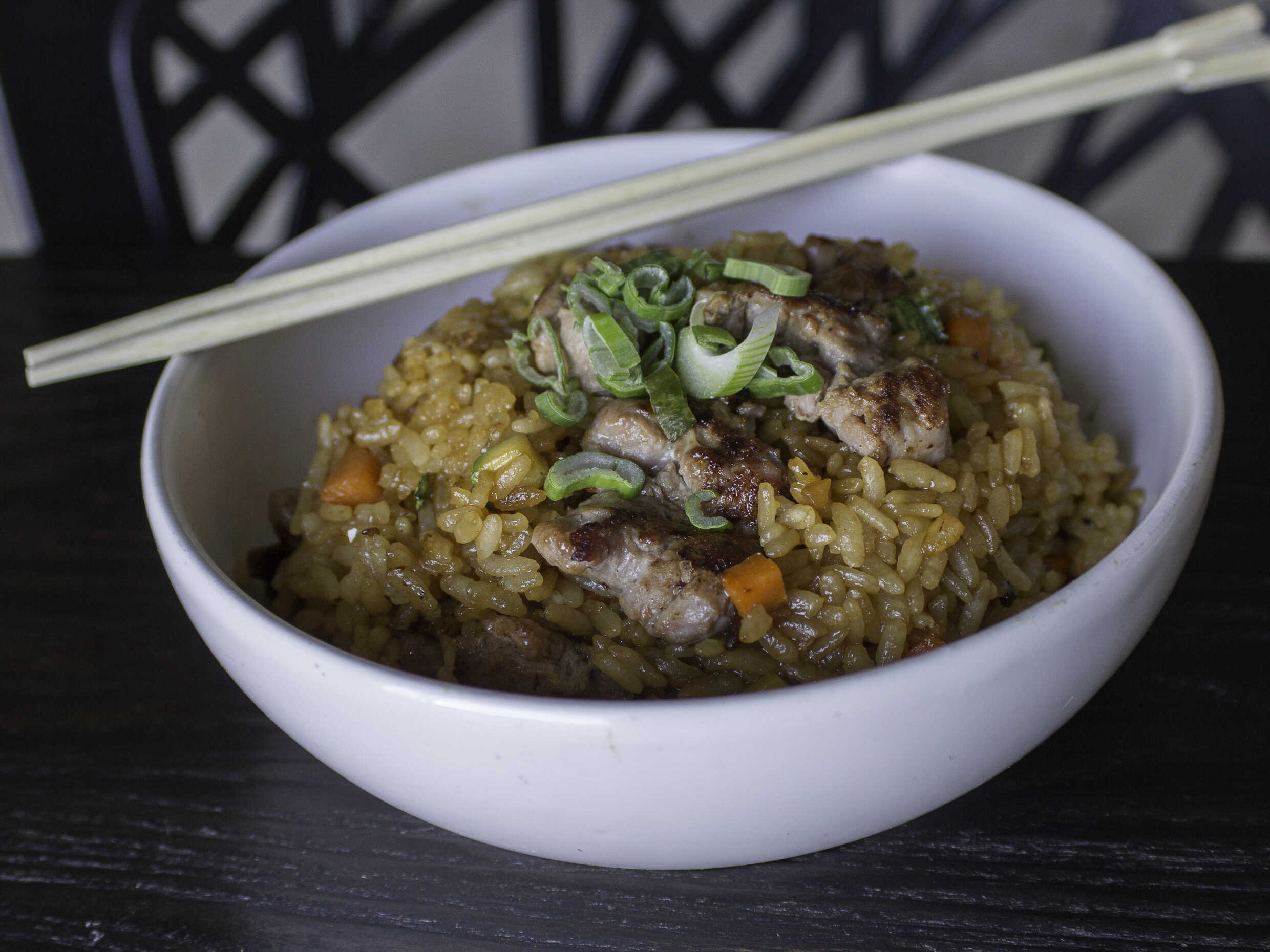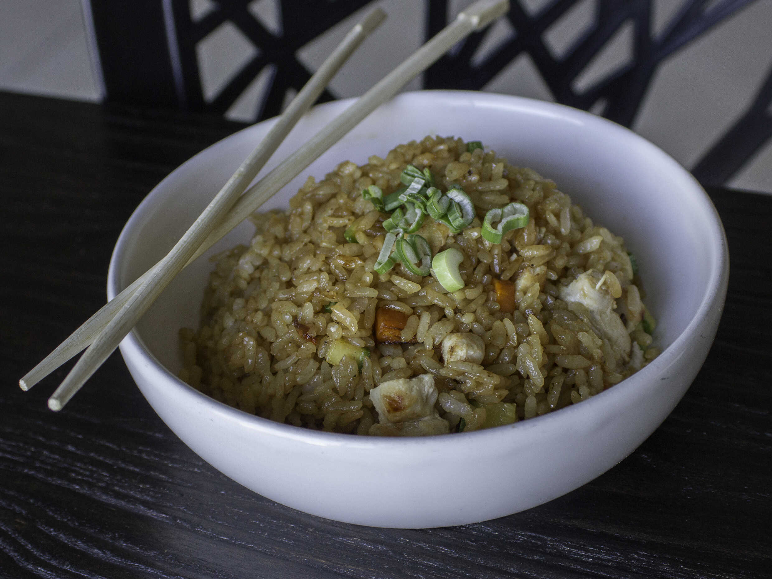 Arroz frito con camarón, arrachera, pollo, zanahoria, calabaza y cebolla.