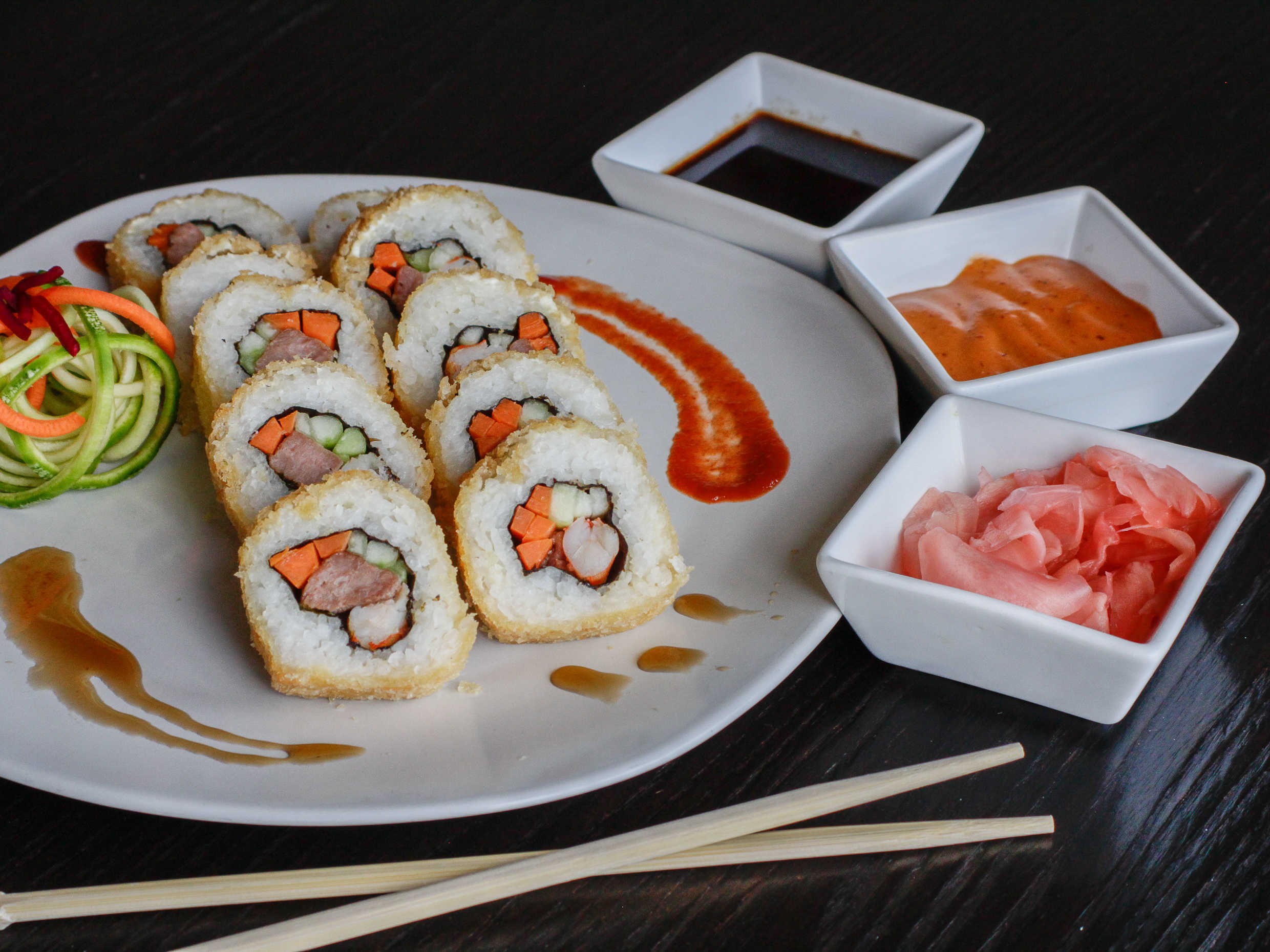 Empanizado, queso Philadelphia, camarón, arrachera, pepino, zanahoria, salsa dulce.