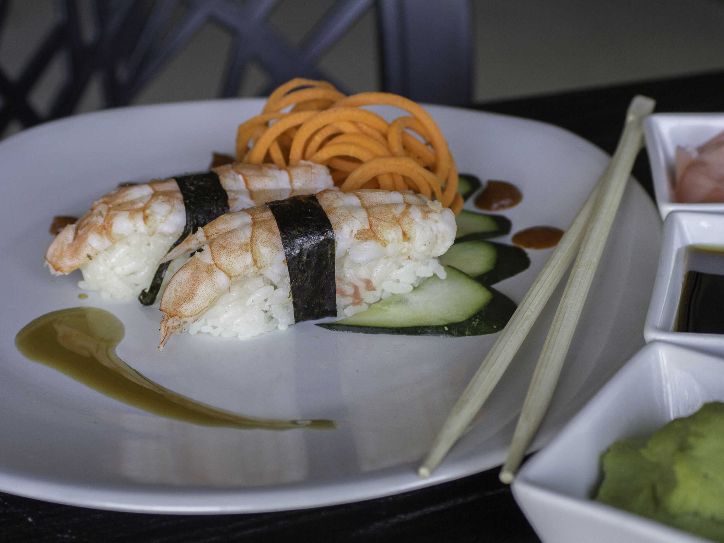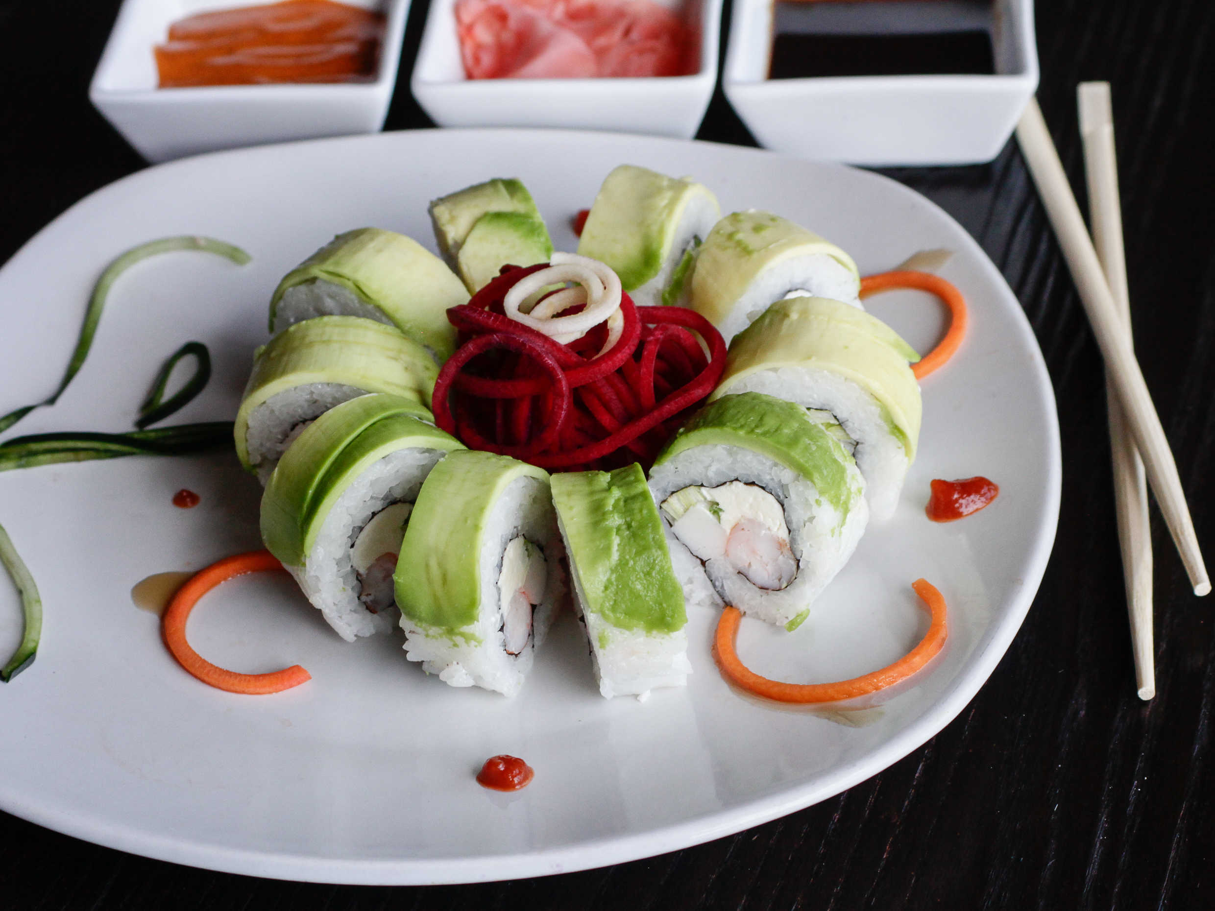 Aguacate camarón, surimi, cebollín, queso Philadelphia salsa ponzu.