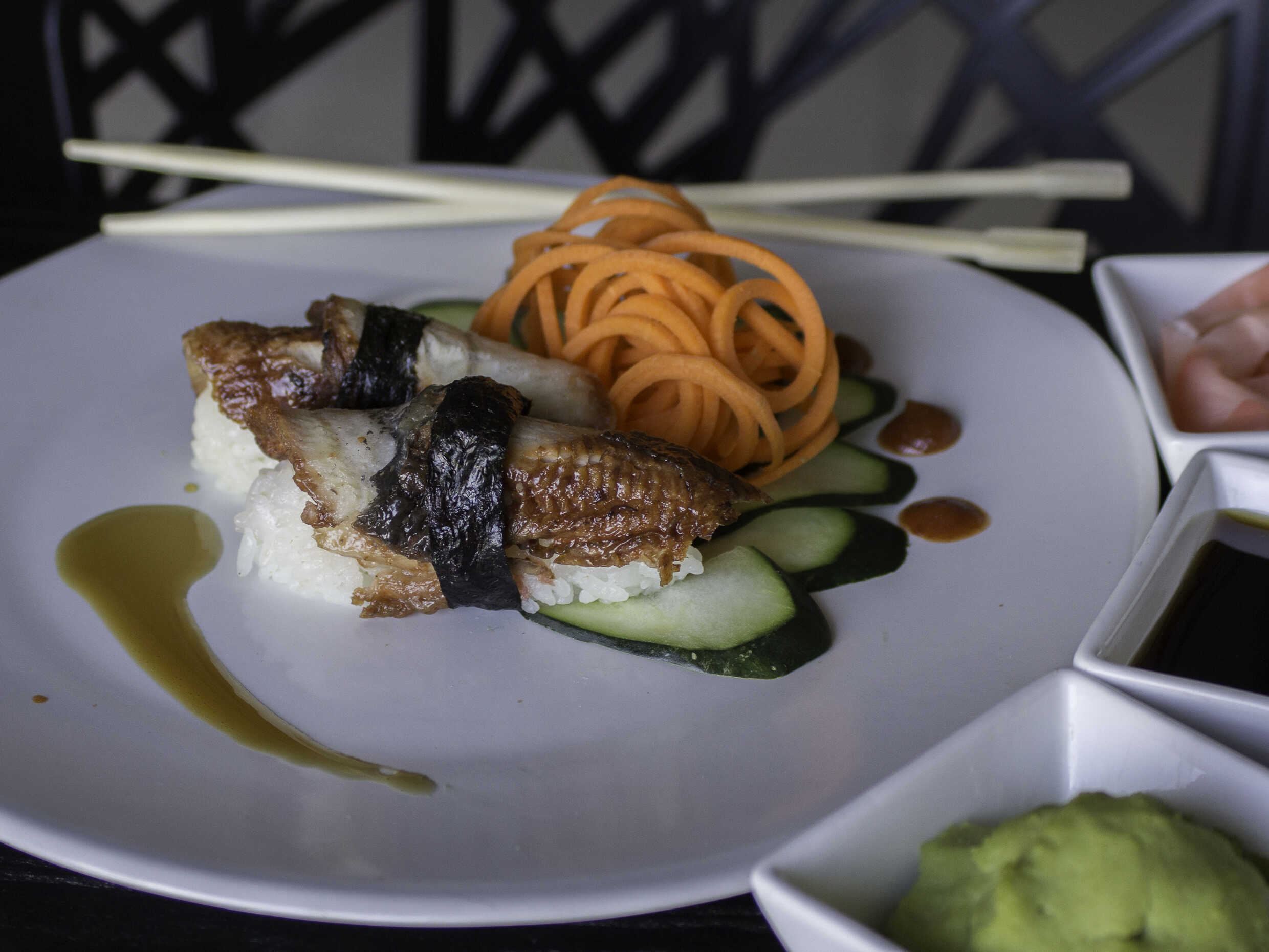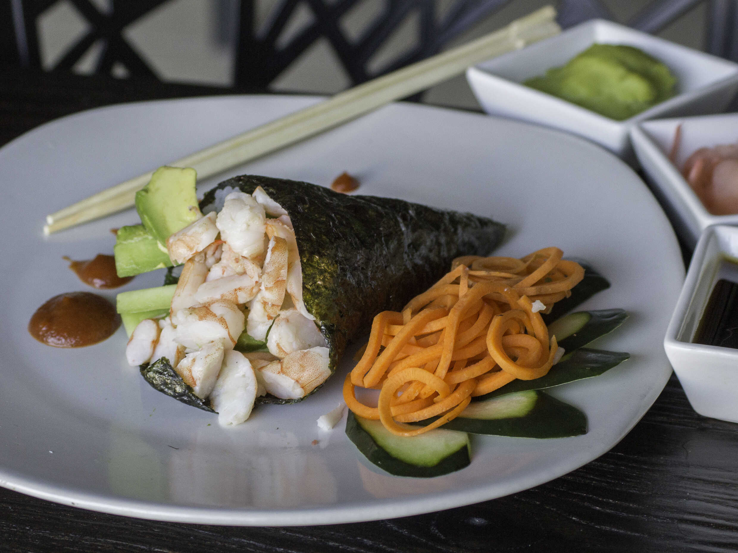 Camarón empanizado, wakame pepino, tampico, aguacate, salsa de anguila, srirasha y chipotle.