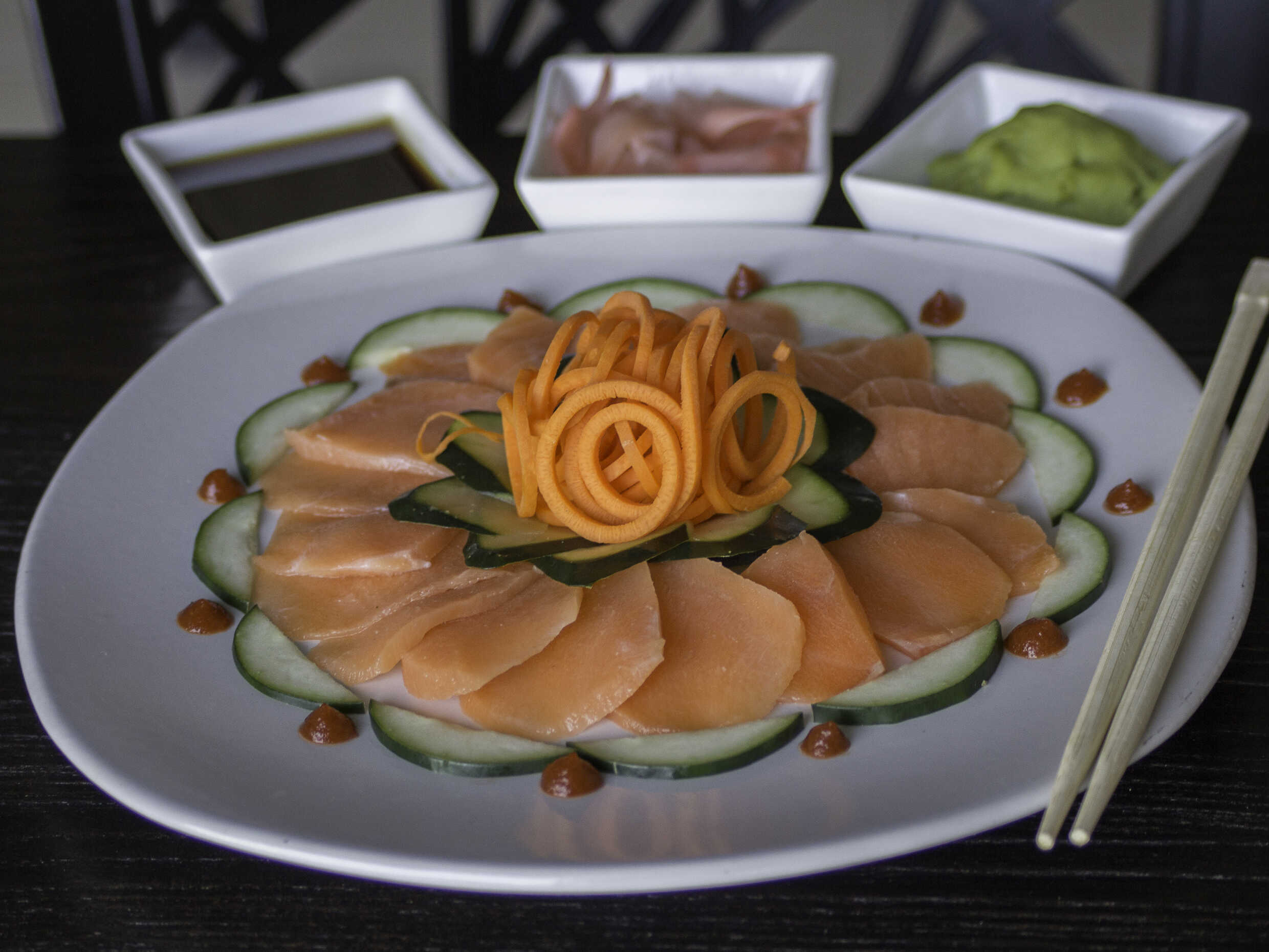 Salmón a la plancha queso gouda camarón empanizado, pepino, aguacate, salsa tampico.