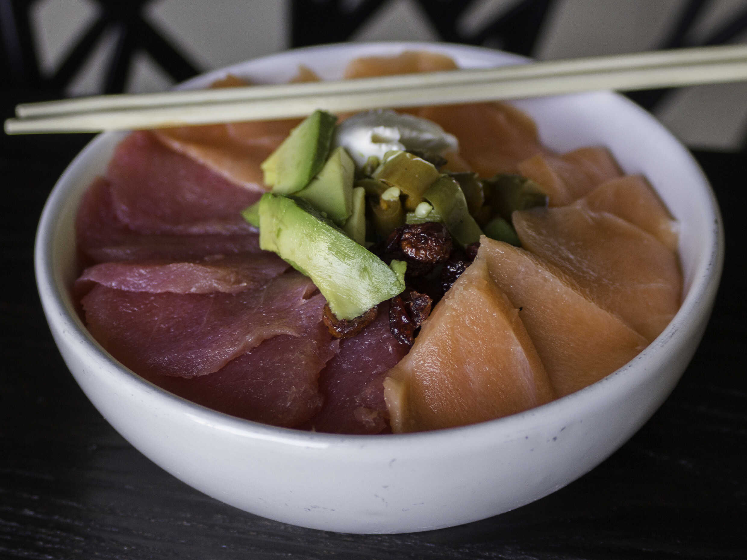 Base de arroz gohan salmón, atún, germen de soya, pepino chiles toreados arándano, aguacate, queso Philadelphia.