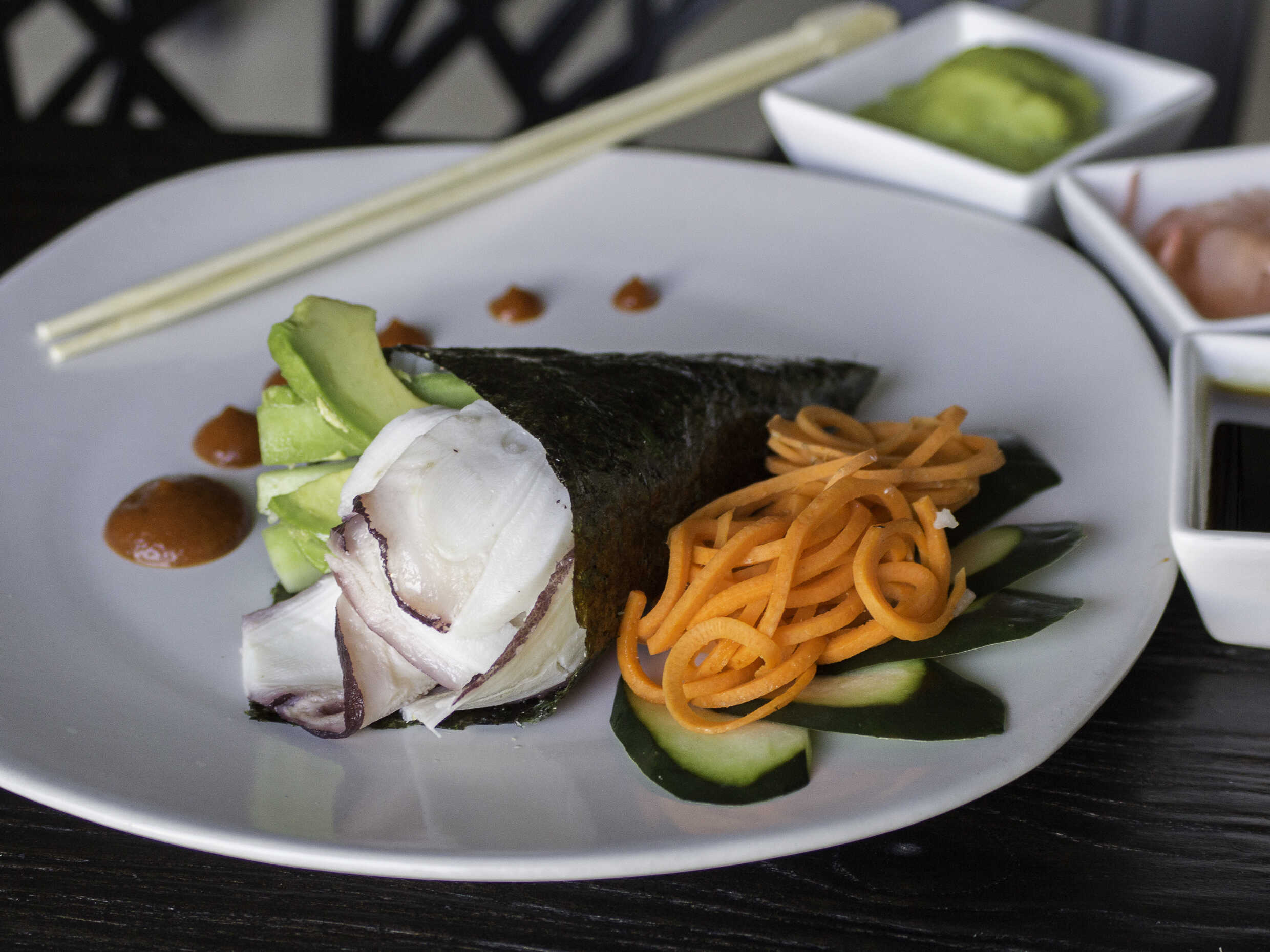 Nori capeado atún spicy, chiles toreados y aguacate salsa chipotle.