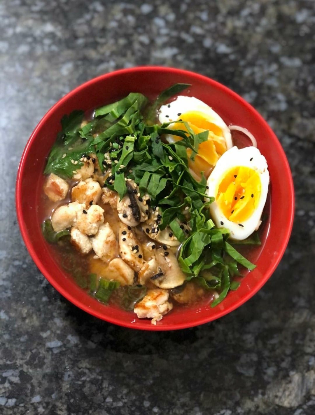 Huevo pasta chukasoba, champiñones, cilantro, espinaca, cebollín, ajonjolí.