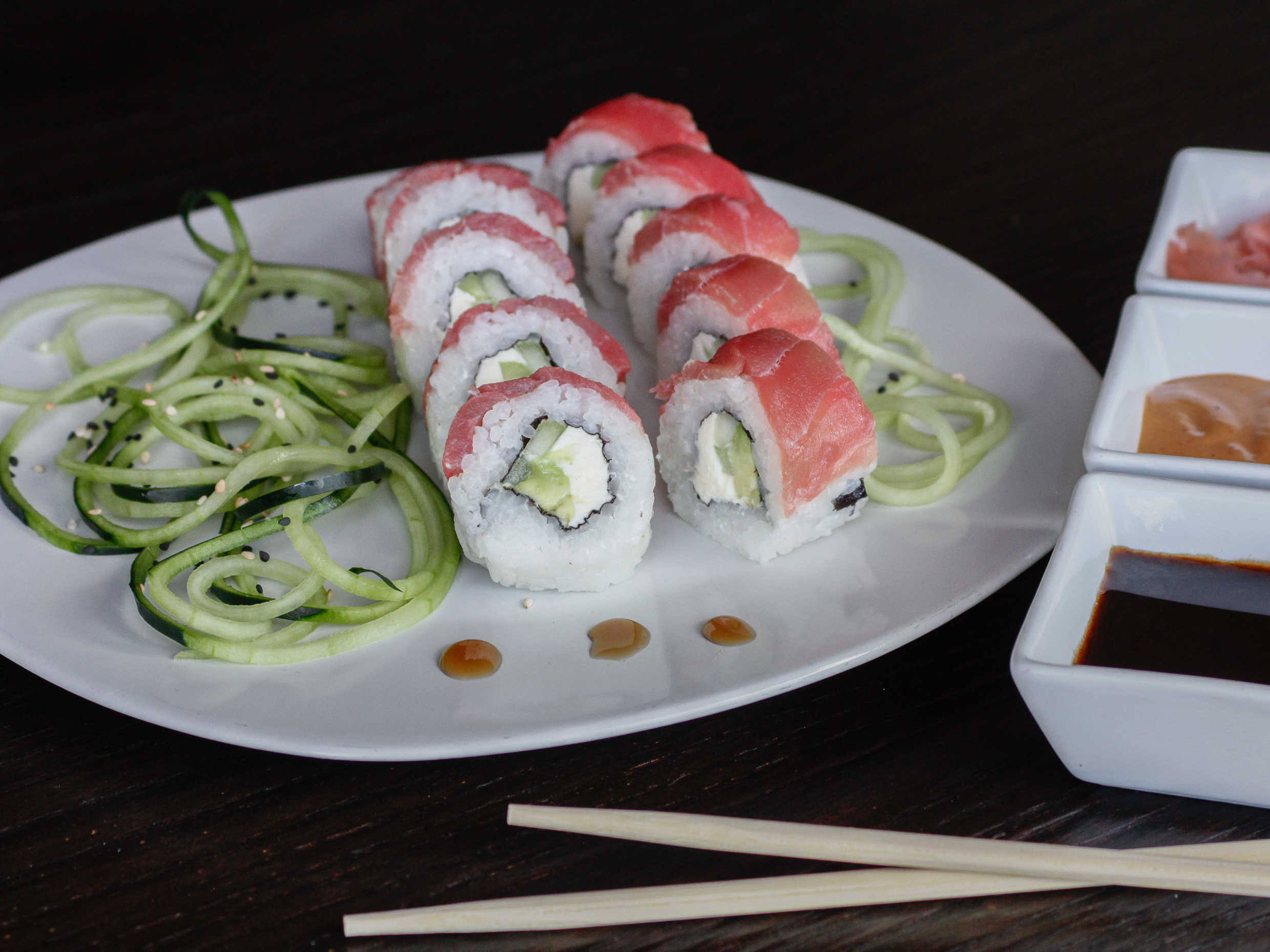 Atún, aguacate, surimi, pepino, queso Philadelphia, salsa chipotle.