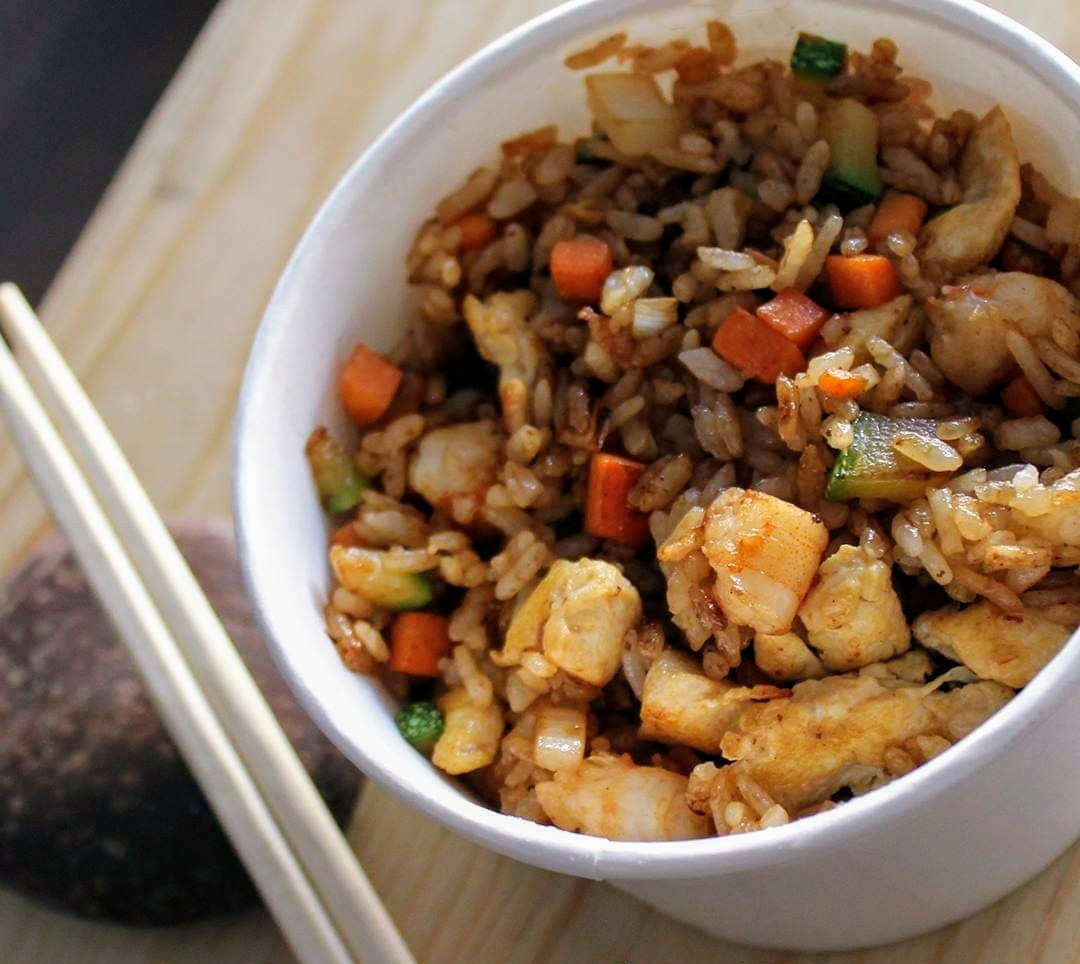 Arroz frito con pollo, zanahoria, calabaza y cebolla.