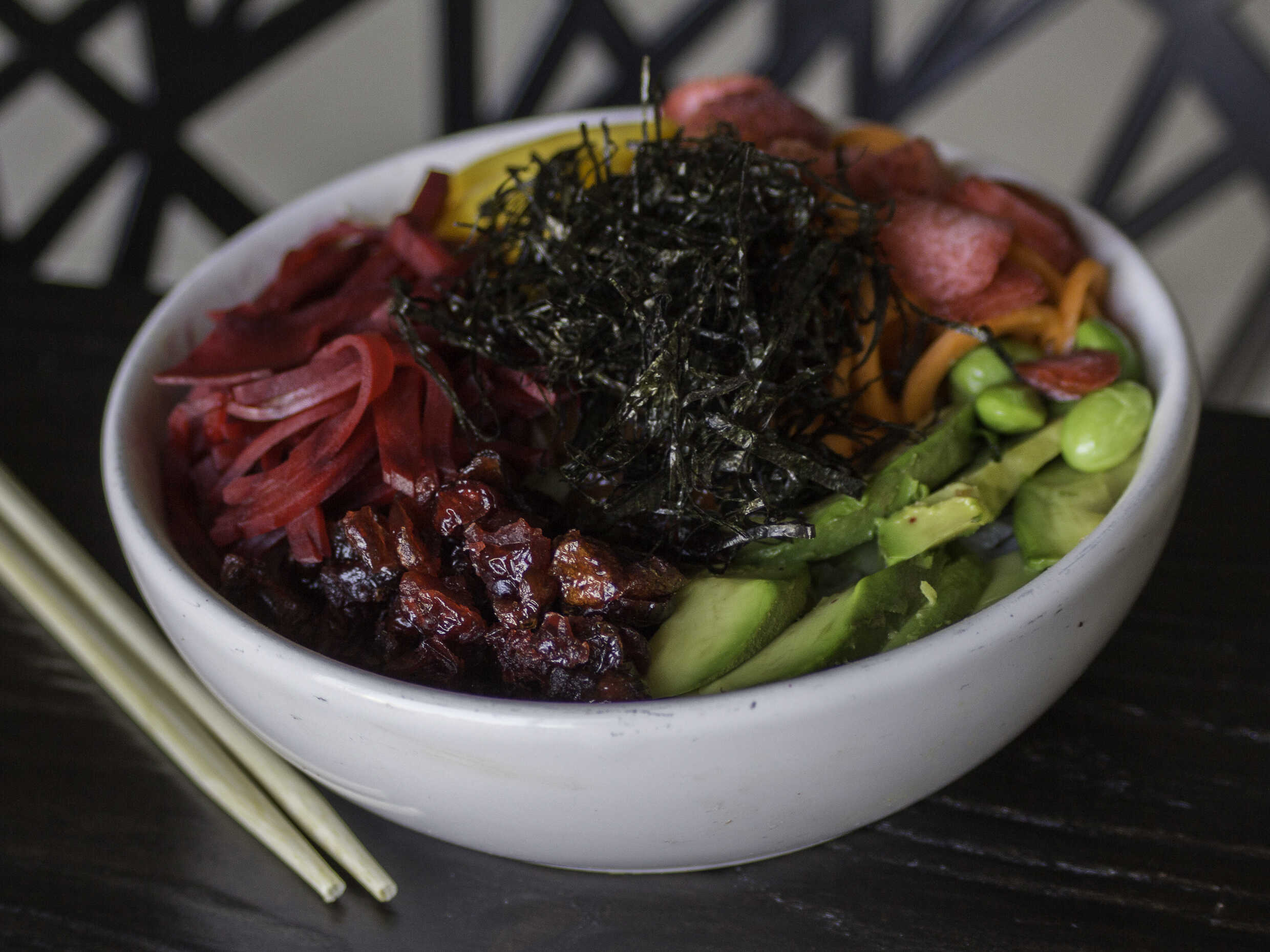 Kakiague de betabel queso Philadelphia arrachera, tampico, aguacate salsa ponzu.