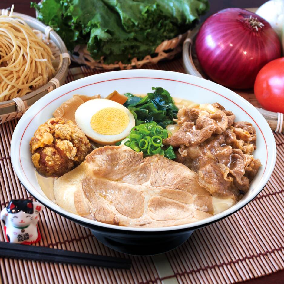 ¡Disfruta el delicioso sabor del Tonkotsu Ramen con una exquisita mezcla de ingredientes! Incluye chashu (carne de cerdo), ternera de Sukiya (carne de res), Kara-Ague (pollo frito estilo japonés) y una variedad de ingredientes que te encantarán!