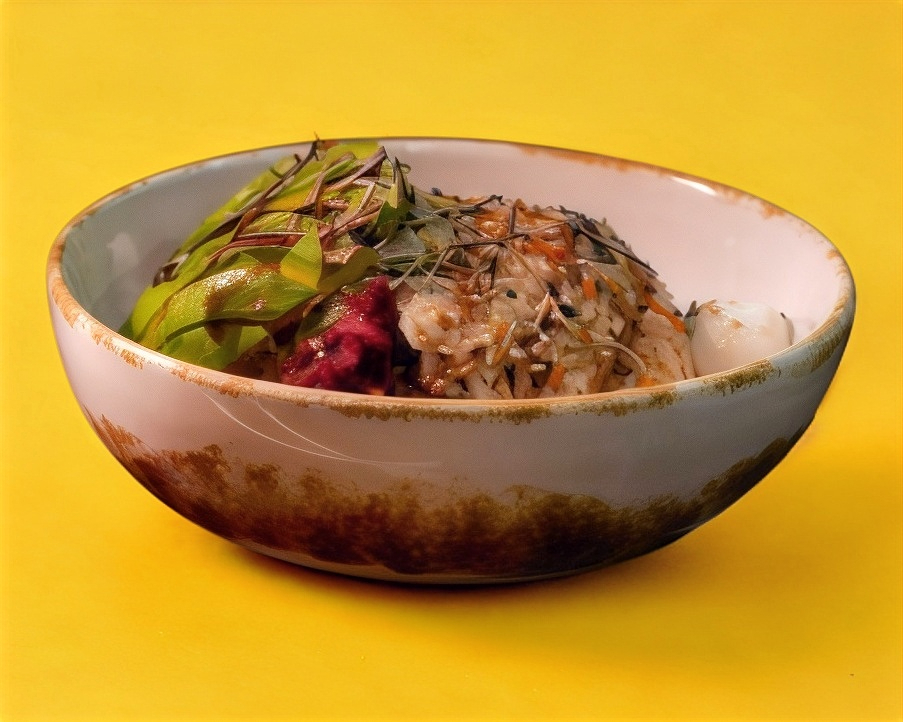 Delicioso arroz frito con verduras mezclado con queso gratinado, camarón y tocino, acompañado de aguacate, tampico y ajonjolí