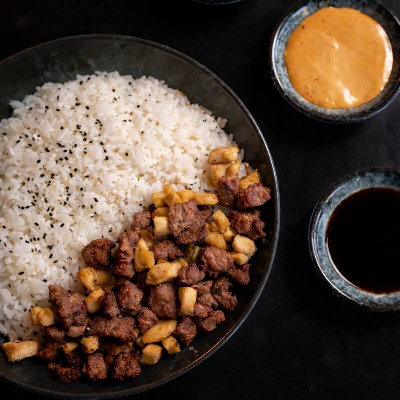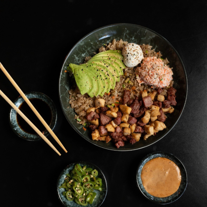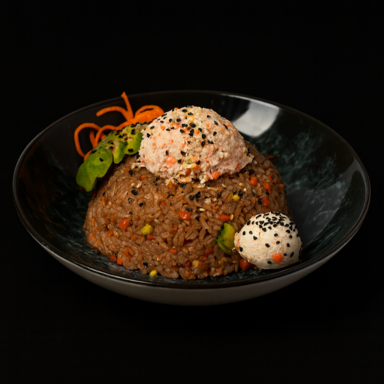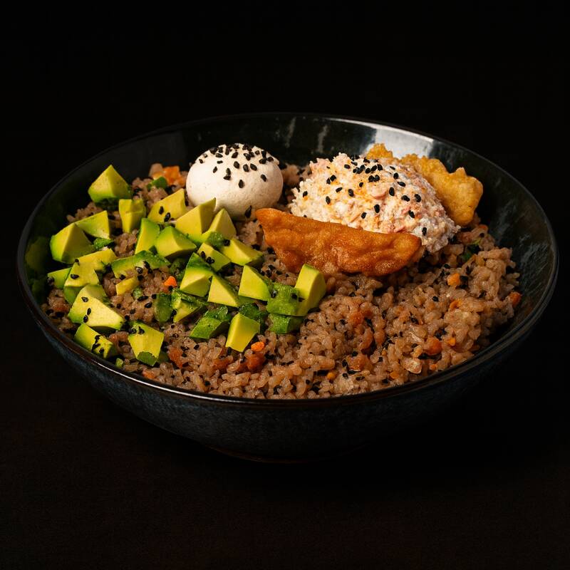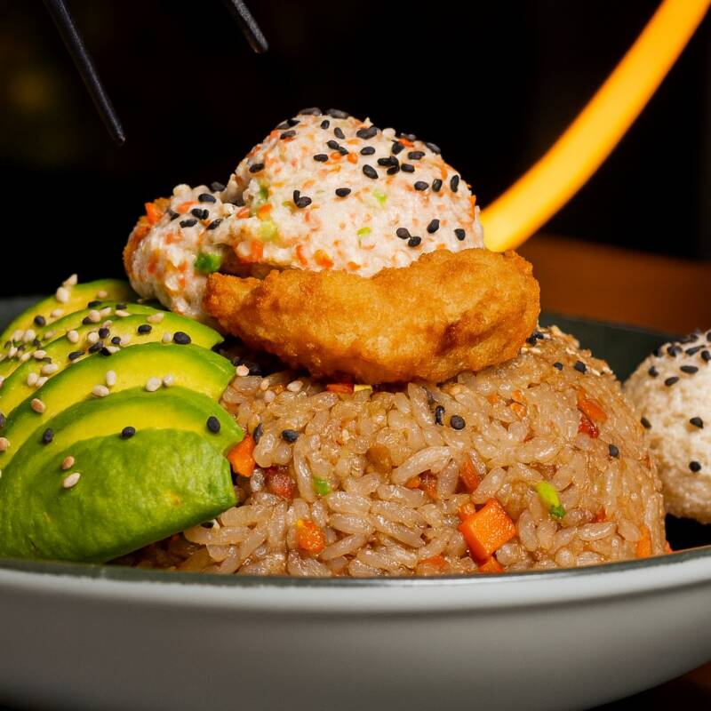 300 gr. de arroz frito preparado con verduras a la plancha y la proteína que elijas, acompañado de aguacate, queso Philadelphia, tampico y ajonjolí negro, con un toque crujiente característico.