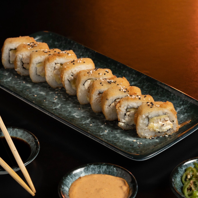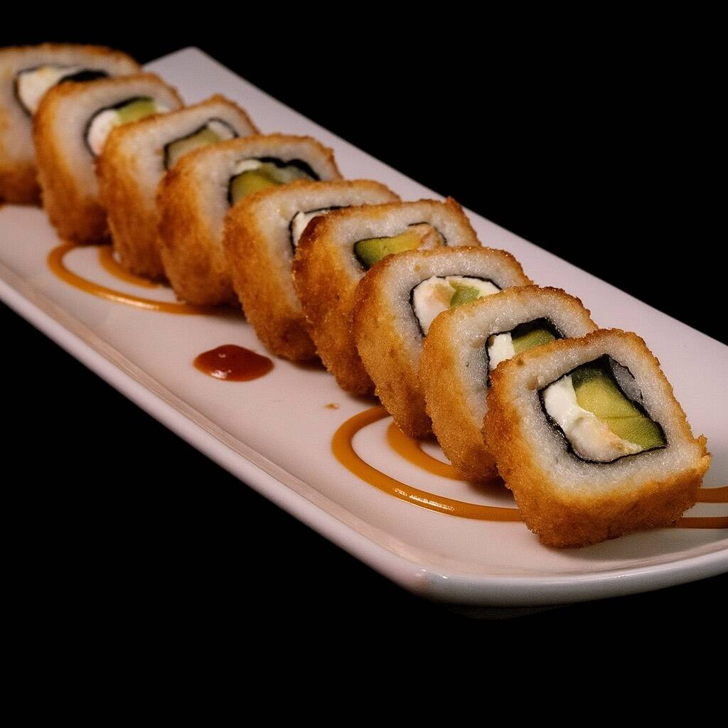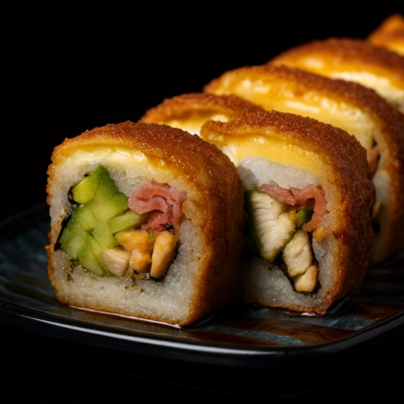 PD: Aguacate, Queso Philadelphia y pollo capeado. PF: EMPANIZADO, con topping de queso spicy gratinado y ajonjolí.