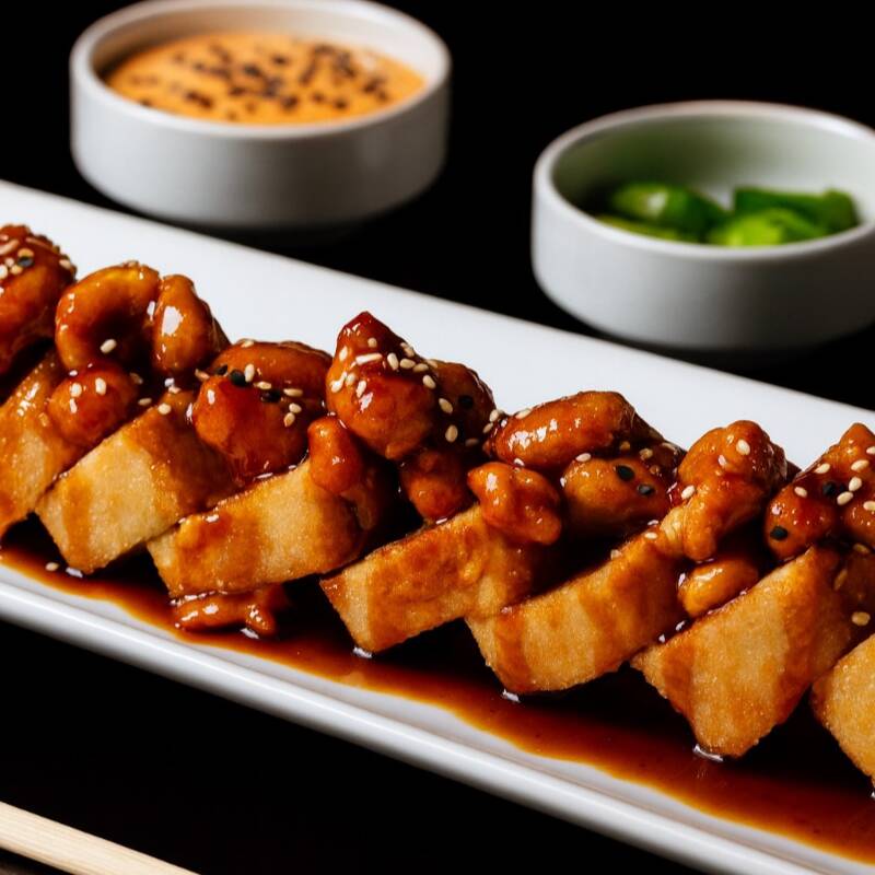 PD: Queso Philadelphia, aguacate y pollo. PF: EMPANIZADO, coronado con topping de pollo agridulce y ajonjolí