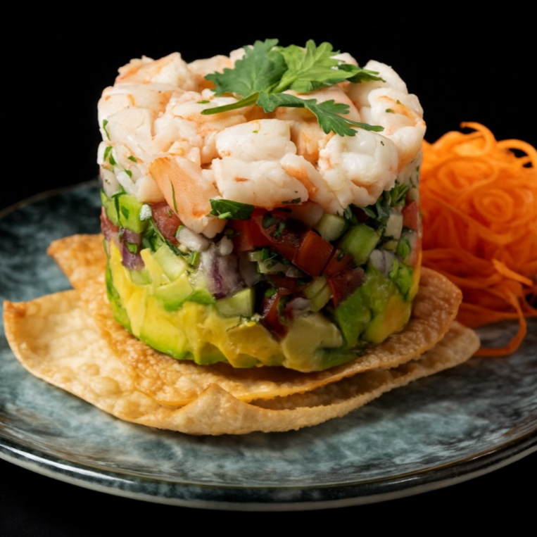 Camarón curtido en limón con chile serrano, aguacate, cebolla morada, cilantro, pepino, tomate y nuestra vinagreta especial, acompañado de dos tostadas de la casa.