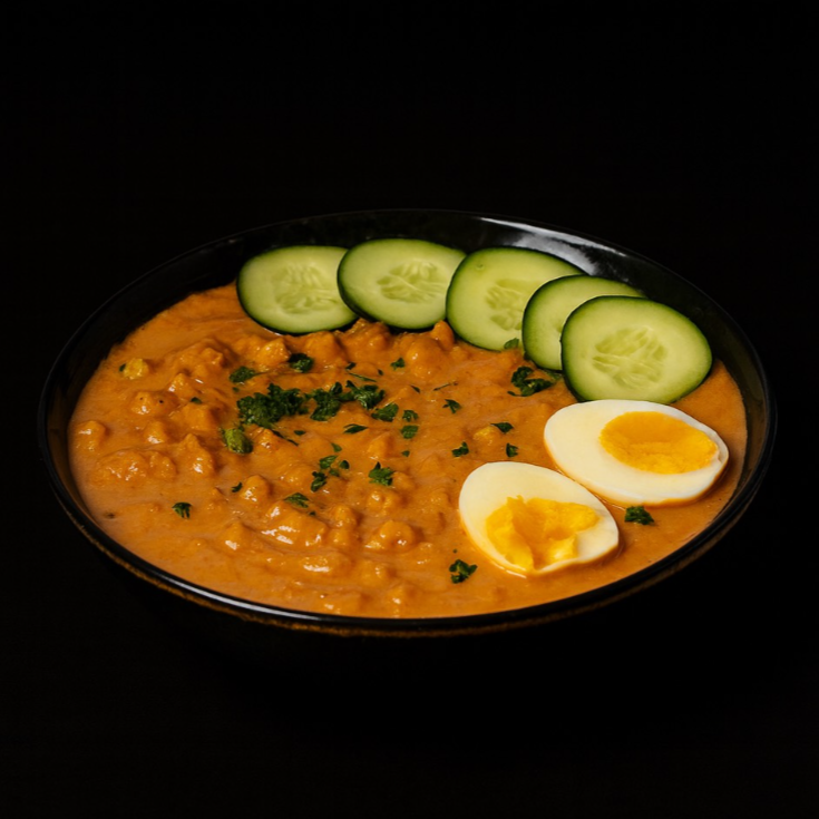 Fideos con camarón, tocino y queso, servidos en caldo cremoso. Acompañado de un huevo cocido y rodajas de pepino para un contraste fresco y delicioso.
