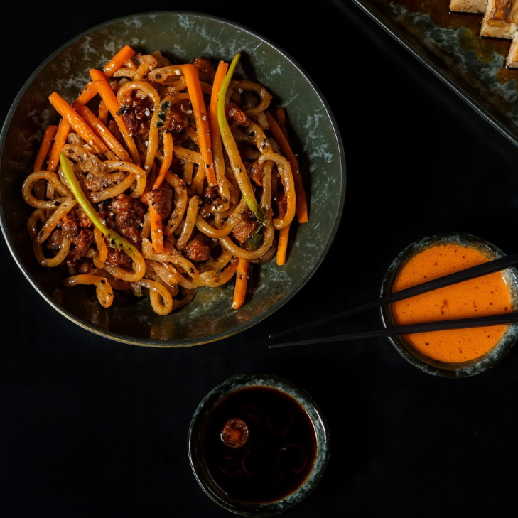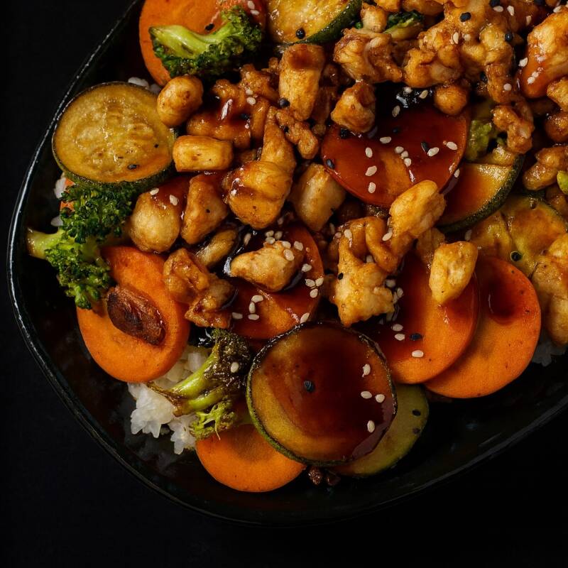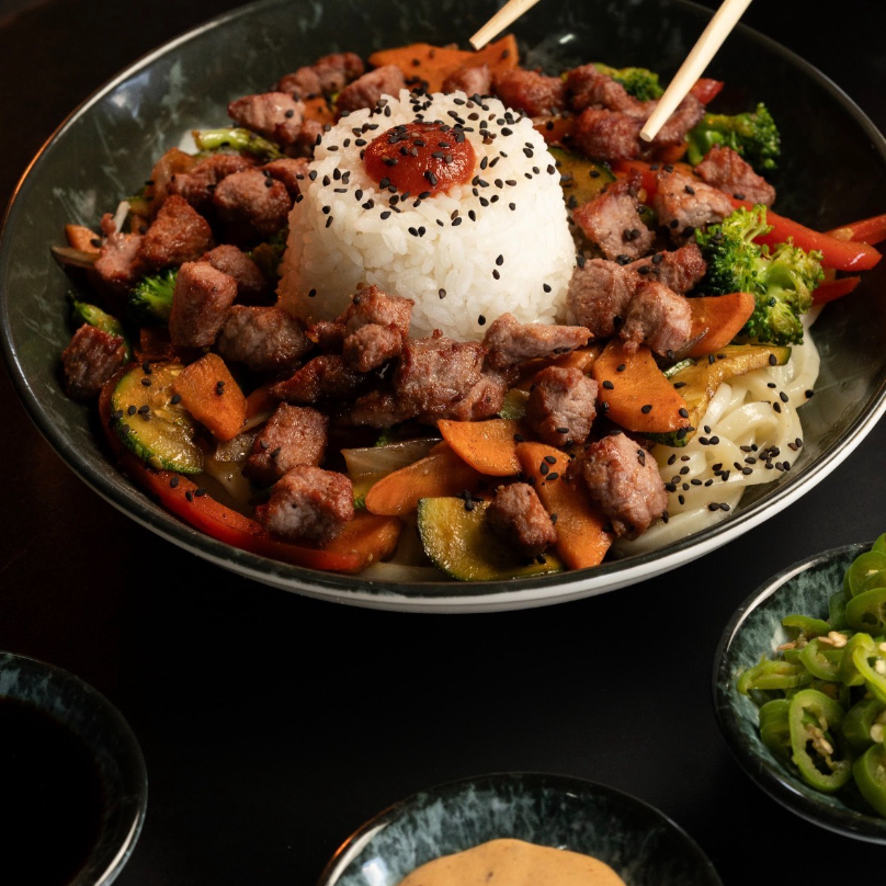 Fideos udon salteados con verduras a la plancha (calabaza, zanahoria y cebolla), mezclados con nuestra salsa teriyaki y acompañados de la proteína que elijas.