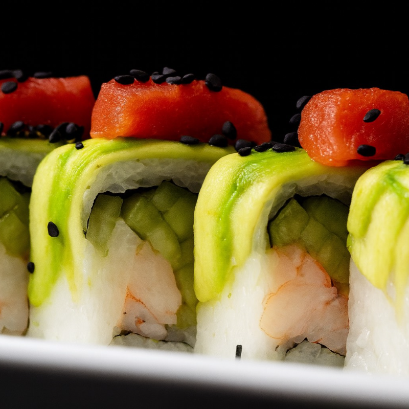 PD: Pepino, aguacate y camarón. PF: Cubierta con aguacate y Philadelphia. Topping de atún macerado.