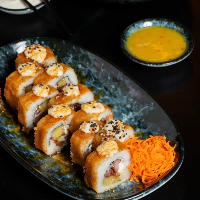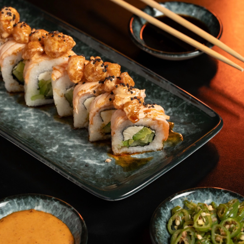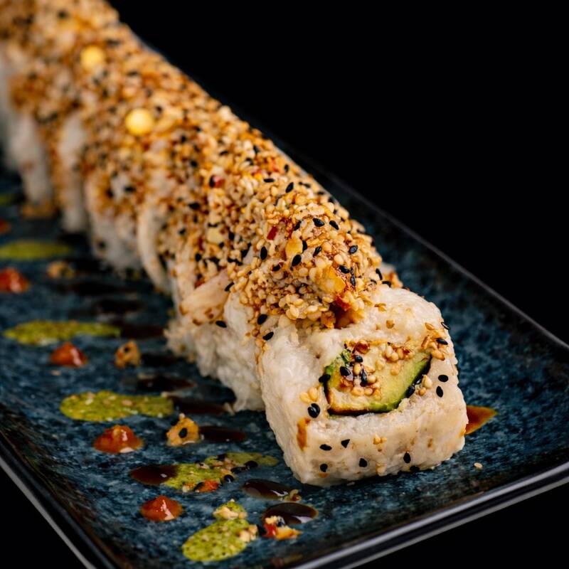 PD: Camarón, aguacate, pepino y queso Philadelphia. PF: EMPANIZADO, topping de tampico, un toque de salsa teriyaki y ajonjolí.
