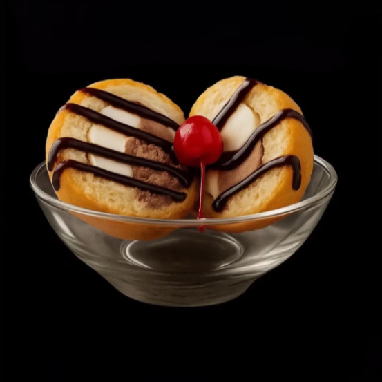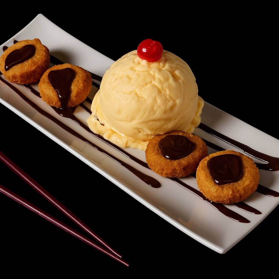 Helado suave envuelto en una capa de tempura dorada y crujiente. Servido con chocolate y cereza para un contraste perfecto entre caliente y frío, crocante y cremoso. Un clásico postre japonés que siempre sorprende.