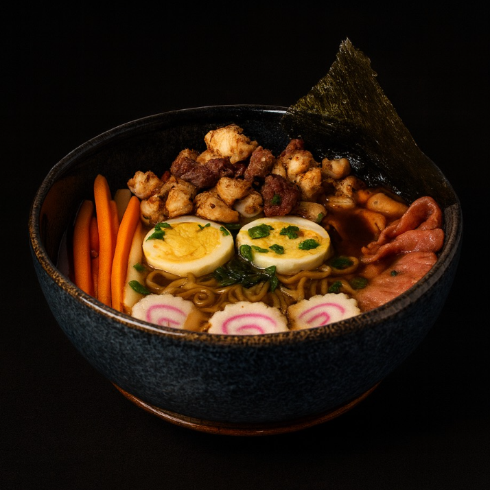 Ramen estilo japonés con fideos, naruto, tocino, huevo cocido, calabaza, zanahoria y la proteína que tú elijas.