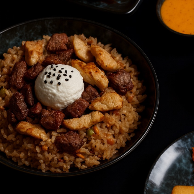 Arroz frito preparado con verduras, res y pollo, salteado al estilo japonés.