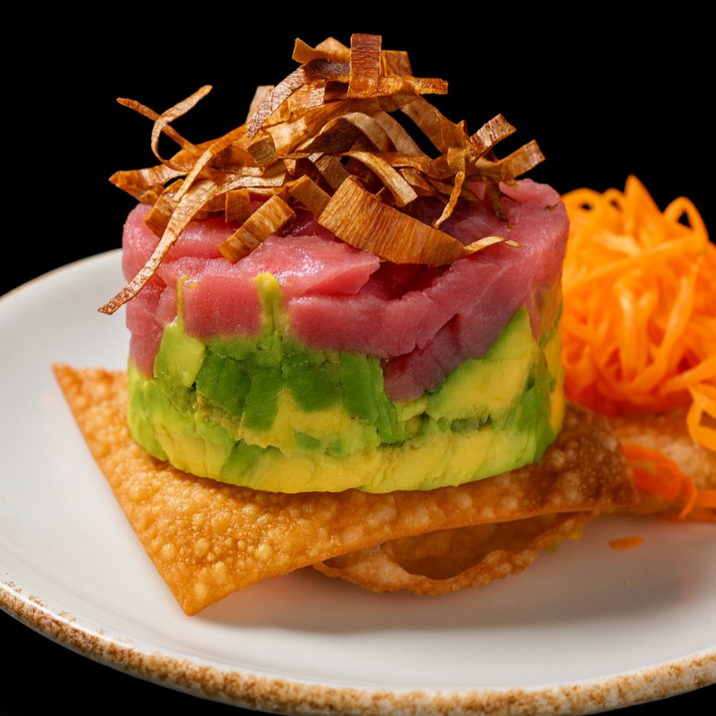 Base de aguacate con atún macerado, poro frito y nuestra vinagreta especial. Servida con dos tostadas de la casa.