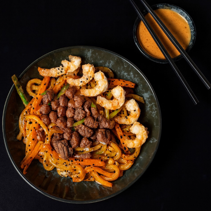 Fideos udon salteados con verduras a la plancha, arrachera, camarón y nuestro chipotle especial cremoso.