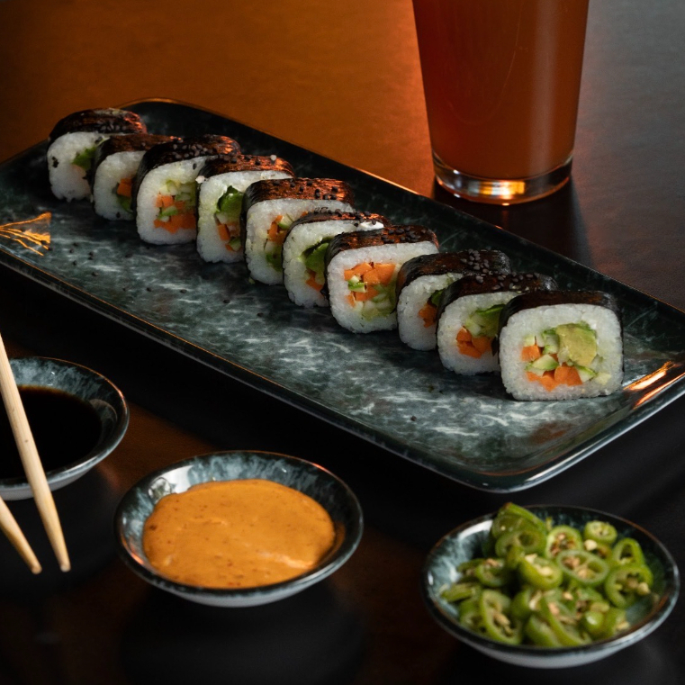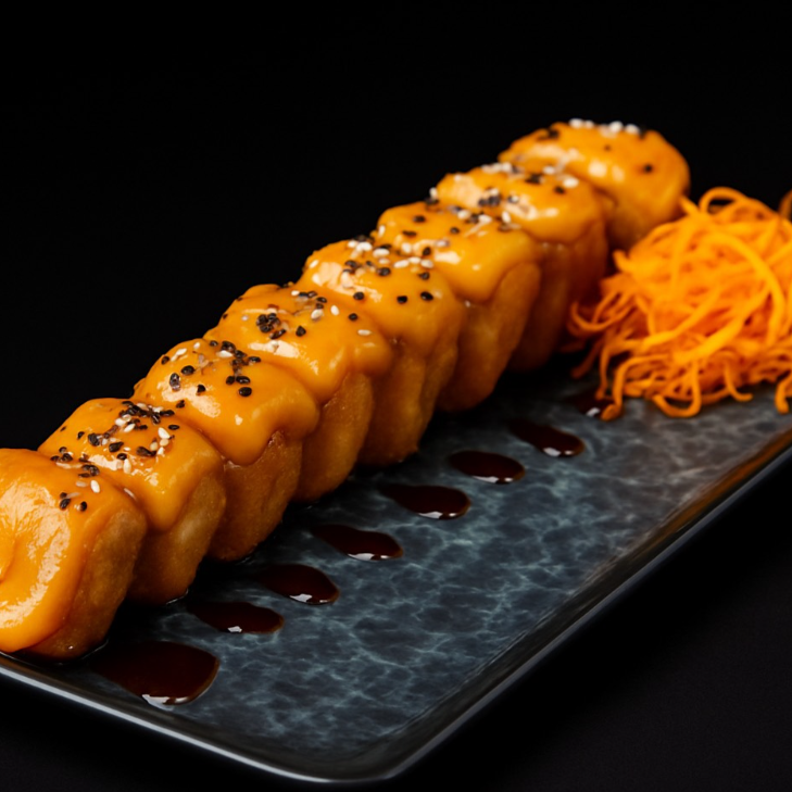 PD: Calabaza, zanahoria, pepino, aguacate y queso Philadelphia. PF: Envuelto en alga nori, con ajonjolí y un toque de salsa teriyaki.