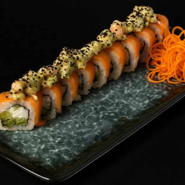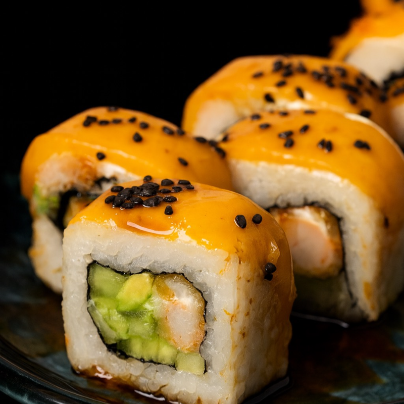 PD: Queso Philadelphia, aguacate y pepino. PF: Cubierto de salmón horneado. Topping de camarón empanizado con spicy, salsa de anguila y ajonjolí blanco.