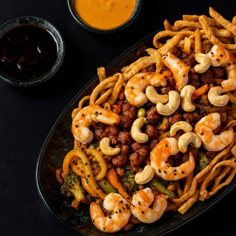Fideos udon salteados con brócoli, cebolla, zanahoria, edamames, nuez de la India, arrachera, camarón y tortilla dorada, bañados en nuestra salsa diabla especial.