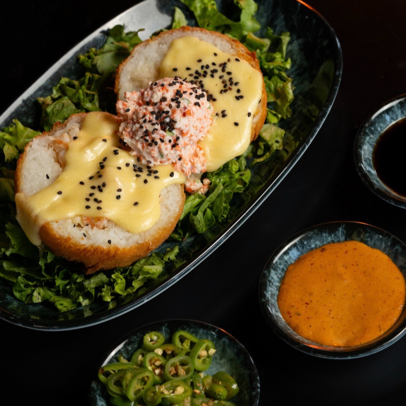 Bola de arroz empanizada, rellena de queso cremoso y la proteína de tu elección. Crujiente por fuera, suave por dentro y llena de sabor.