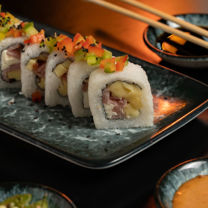 PD: Jamón serrano, queso manchego y queso Philadelphia. PF: Topping de tampico, pimiento picado y un toque de salsa teriyaki.
