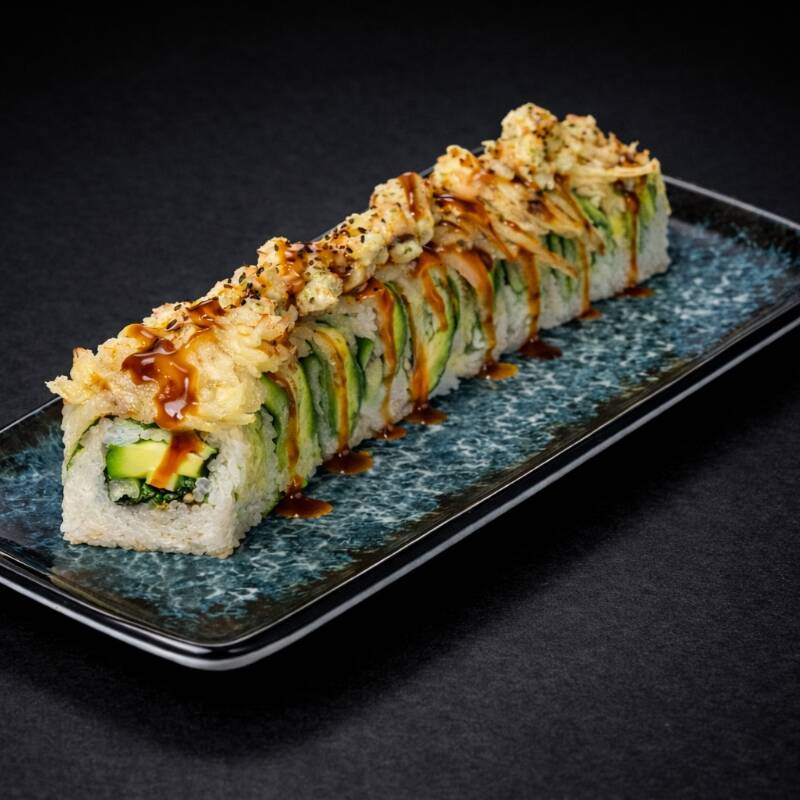 PD: Camarón empanizado crujiente, pepino y aguacate. PF: Cubierto con surimi, un toque de salsa teriyaki y ajonjolí.